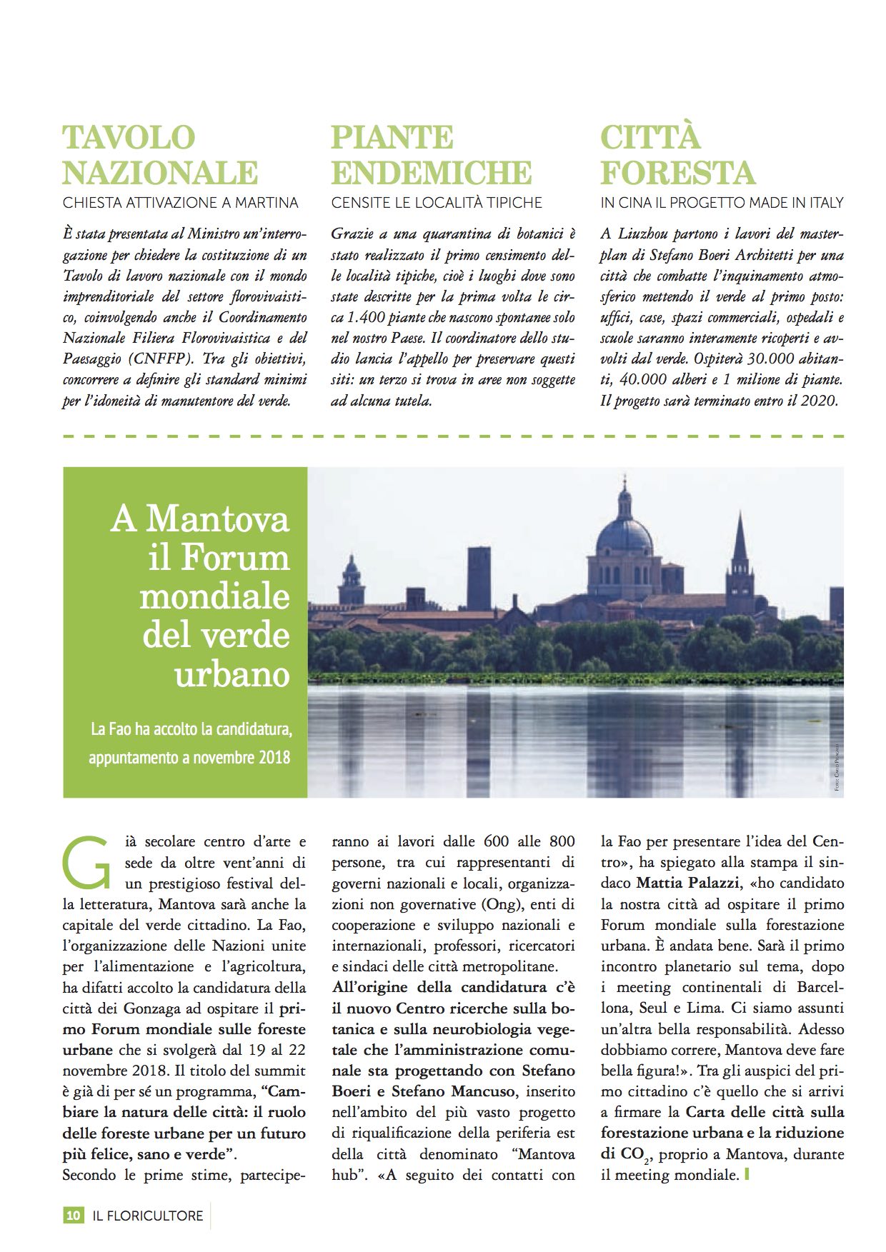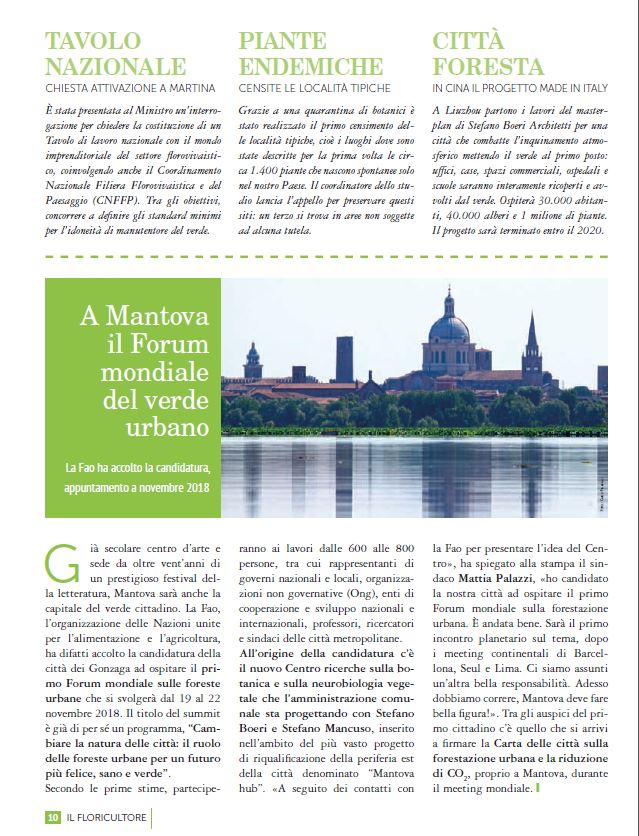 5 9月 2017 森林城市和城市森林世界论坛 2017年9月5日 “Il Floricultore”杂志设计了连接意大利,中国和世界其他地方的绿色线条:生物多样性的概念被建筑设计事务所应用于将实现城市规模建筑的柳州森林城市项目中。这也是世界上第一座中国森林城市。同时它也是第一个植物学和神经生物学的研究中心,由斯坦法诺.博埃里、Stefano Mancuso和部分曼图亚中心协调合作。该中心是由粮农组织确认的曼图亚城市森林世界论坛在2018年11月19日至22日举行的地点。
