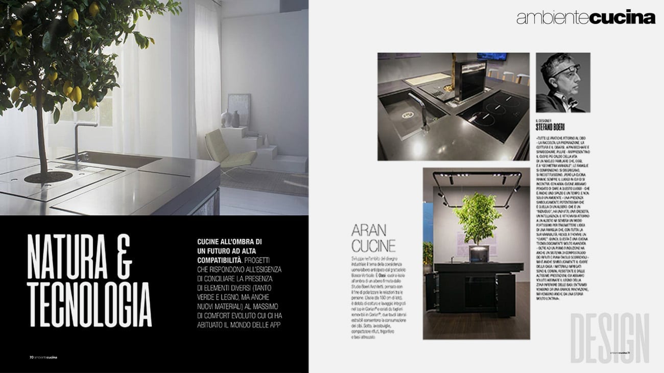 该系统拥有一个坚固的可丽耐台面,带有感应式燃烧器和滑动台,下方是一个先进的废弃材料处理系统和设备。这是一种重新诠释垂直森林的视觉与自然元素结合的设计。Oasi不仅仅是一个产品,更是一个原始生存空间,在树梢下容纳现代家庭多变的生活方式的厨房桌。