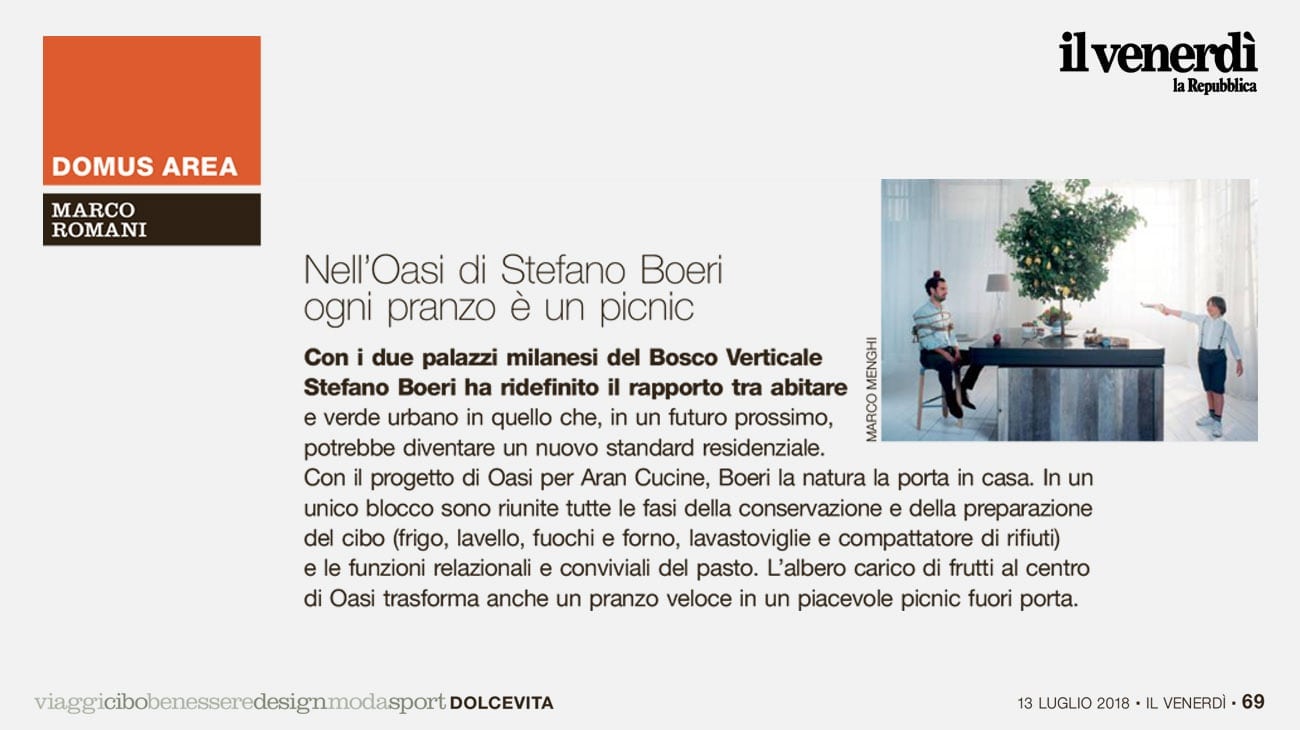 与Aran厨房的合作,目的在于将垂直森林的一小部分植被引入到室内。与Oasi(oasis)一起,博埃里建筑设计事务所将经典的岛型厨房布局改造成一个方形的餐桌烹饪区,将传统生活空间中的所有基本元素与所有允许准备、保护和不浪费食物的技术设备结合在一起。