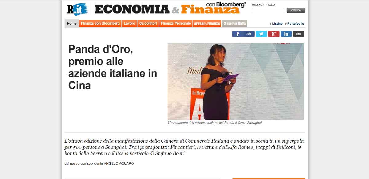 19 6月 2017 REPUBBLICA.IT | 金熊猫 2017年6月19日 中国意大利商会设立的金熊猫奖今年迎来第八届,此奖在中国设立以表彰在中国有卓越发展的意大利个体或集团。 将垂直森林引进到南京的垂直森林创始人斯坦法诺·博埃里被授予绿熊猫奖。 http://www.repubblica.it/economia/2017/06/18/news/panda_d_oro_premio_alle_aziende_italiane_in_cina-168416019/
