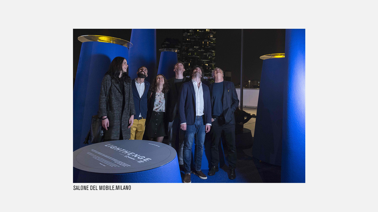 - 2018年米兰国际家具展览会。图中由博埃里建筑设计事务所为Edison设计的LightHenge城市装置,首次在位于创新设计区的中心的Piazza Gae Aulenti上展出; 它包含了一个发光和声音设备和对城市和能源的隐喻,在设计周期间创造了一个在大都市流动中消除拥挤的空间。