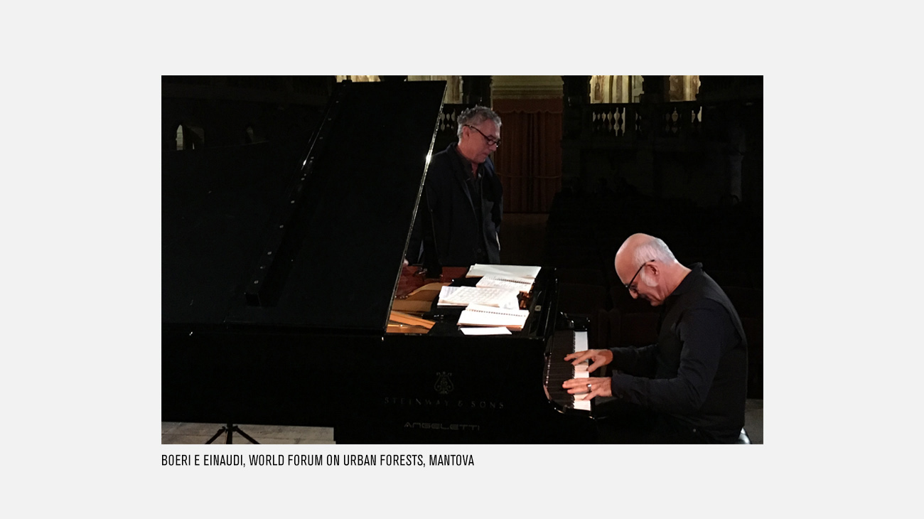 - 博埃里与Ludovico Einaudi的会面。 这次会面发生在2018年第一届城市森林世界论坛之际。在曼图亚Bibiena剧院中,双方就气候变化,森林的重要性,以自然和音乐之声进行了对话。