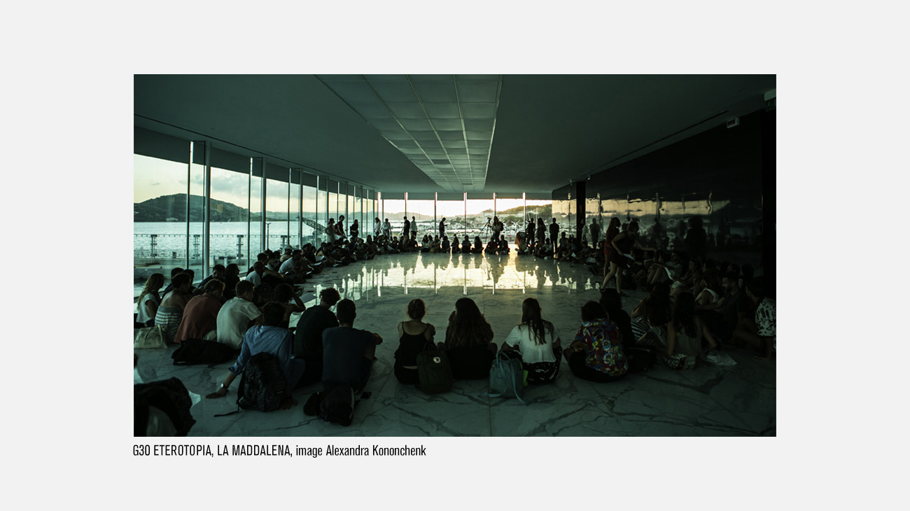 - 马达莱纳岛前军械库G30:斯坦法诺.博埃里与来自全球30个国家的130名Eterotopia的年轻人会面,邀请他们一起想象关于未来的建议和关键词。 在2009年的G8案例之后,Eterotopia的G30是一个重要的时刻,以积极的方式重新思考该岛和军械库的未来。我们希望2019年将成为La Maddalena和地球的积极变革之年。