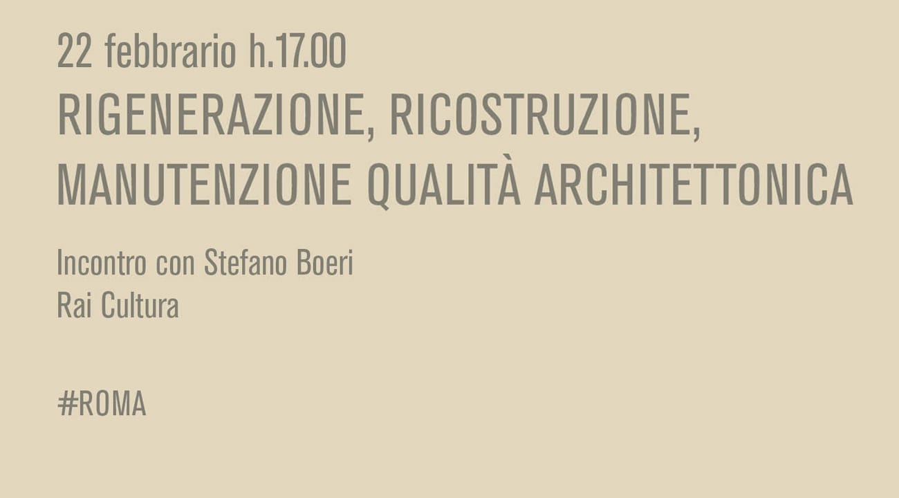 2月22日下午5点,斯坦法诺.博埃里将在罗马MACRO ASILOArea Incontri 举办关于城市重建,再生和建筑质量的讲座。该活动是由Marta Frantocci为RAI Cultura策展的关于世界末日策划的五个课堂活动之一。