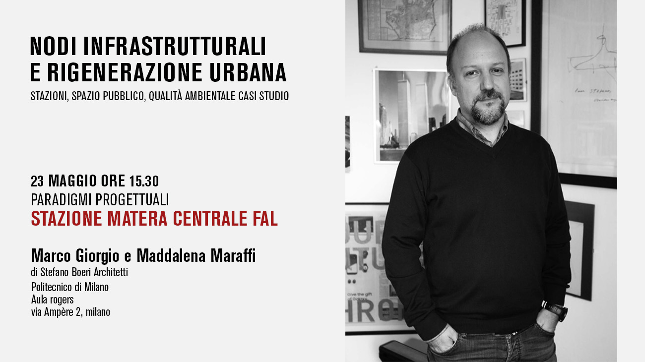 5月23日周四,下午3点30分。在米兰理工大学的Aula Rogers,博埃里建筑设计事务所项目总监Marco Giorgio和建筑师Maddalena Maraffi将在名为“基础设施节点与城市再生。 车站、公共空间、环境质量。 案例研究。”的会议上介绍马泰拉FAL中央车站项目。