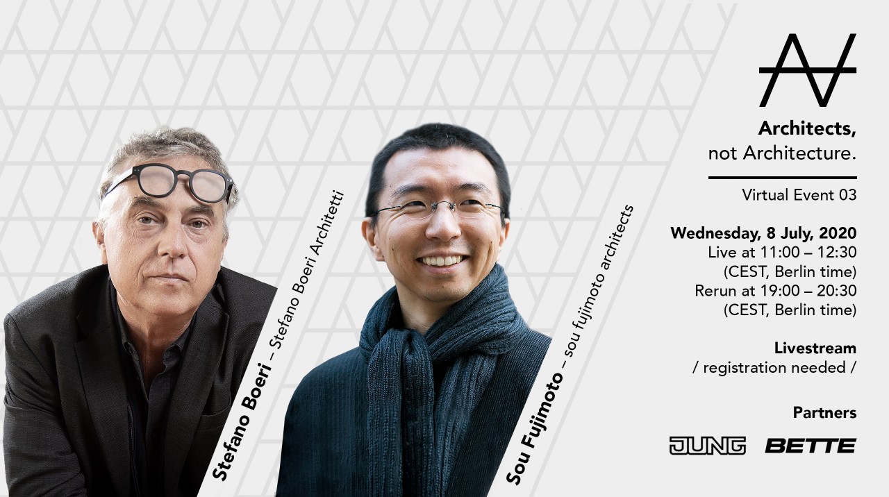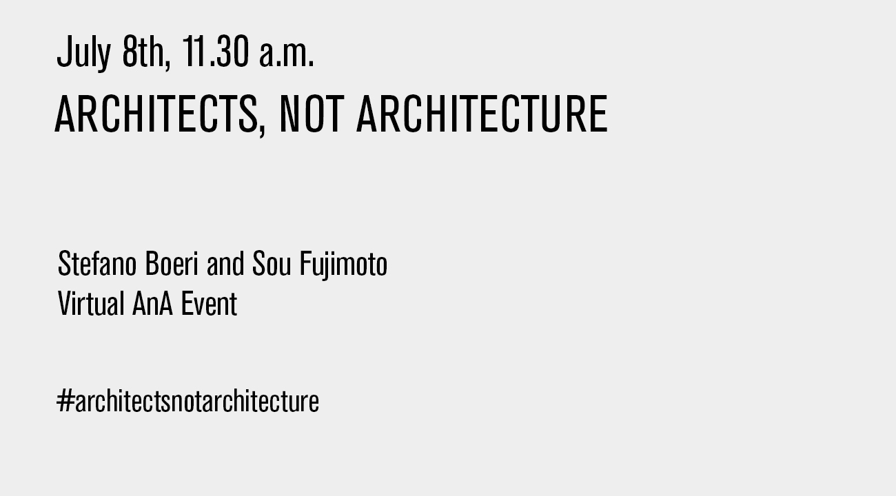 7月8日,星期三,斯坦法诺.博埃里Sou Fujimoto对话,参加AnA-建筑师, 不是建筑-Home Edition 2020的现场直播活动。个人经历,重要的创作时期,文化影响力和项目将在11点至12:30进行现场直播( CEST,柏林时间),然后从19:00开始返回/重播。 晚上8:30(CEST,柏林时间)。