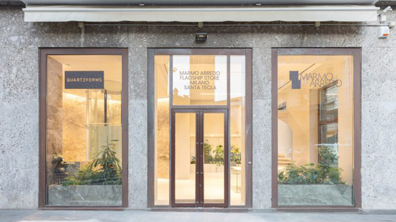 MarmoArredo Milano:陈列室,位于 Salone del Mobile、Kiglia 餐桌和 Marmo Arredo Group 的 Tecla 系统。在 Via Santa Tecla Marmo Arredo 的新展厅内,展示一系列适用于厨房、浴室、地板、桌面和所有类型表面的解决方案。