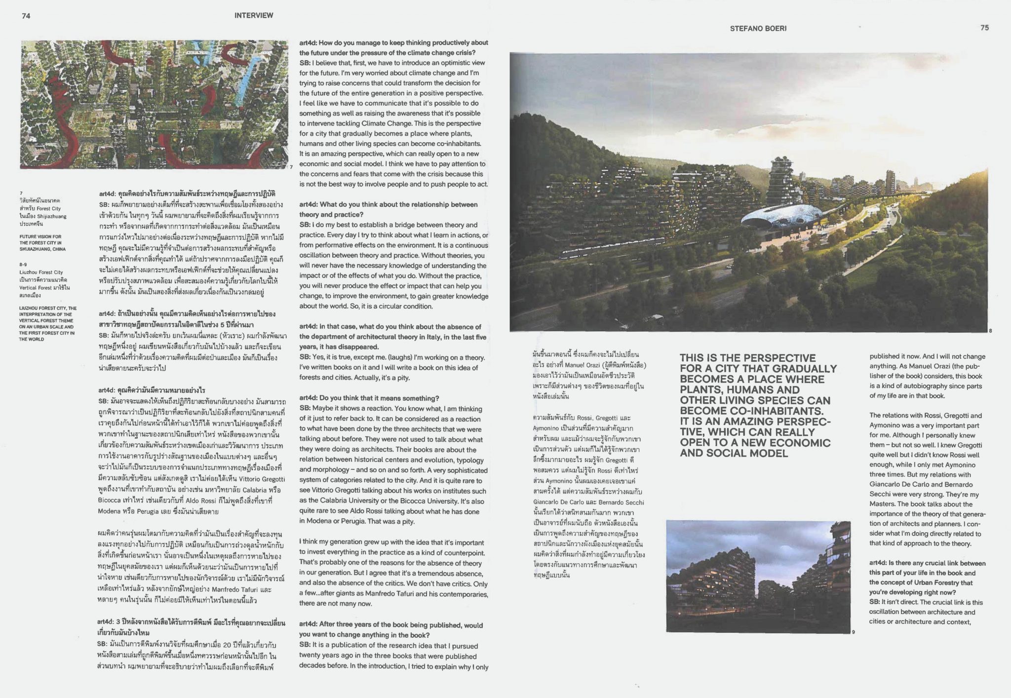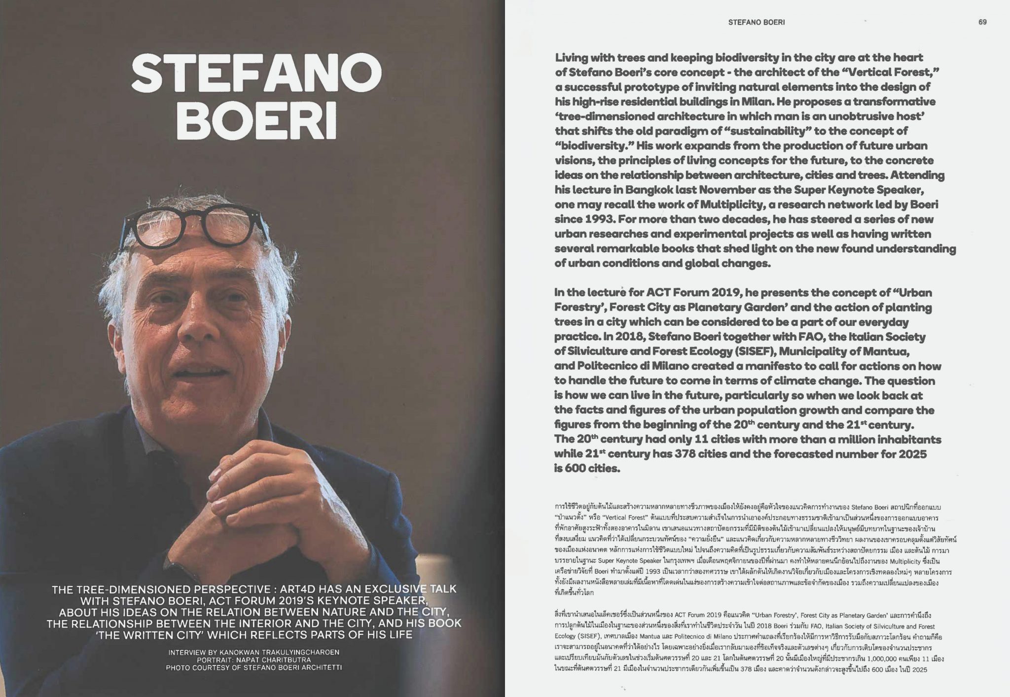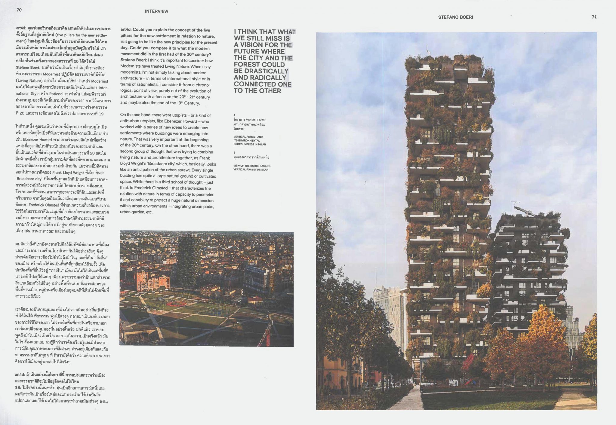 art4d 是一本总部设在曼谷的建筑与设计杂志,在国际范围内发行,该杂志对斯坦法诺.博埃里进行了长时间的采访,通过有意识的垂直森林和都市森林化设计,通过增加人与自然之间的关系,告诉人们对未来的想法和观点。 从米兰第一个建立的垂直森林到坎昆的智慧森林城市,博埃里建筑设计事务所致力于新现实的设计,创造愿景,开辟创新的道路,走向现代经济和社会模式。