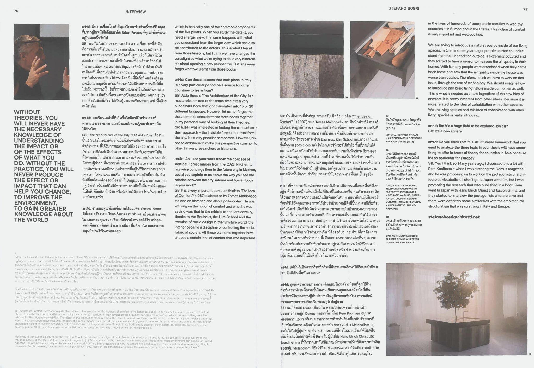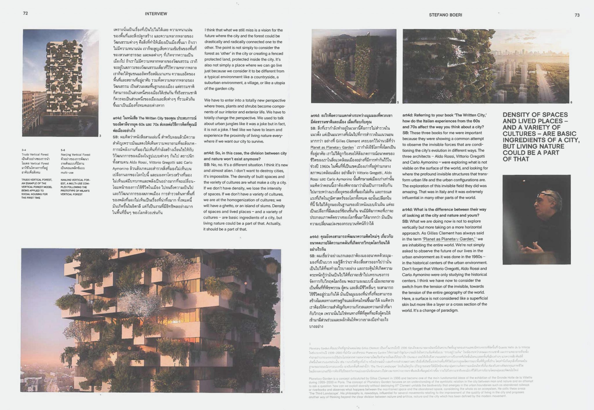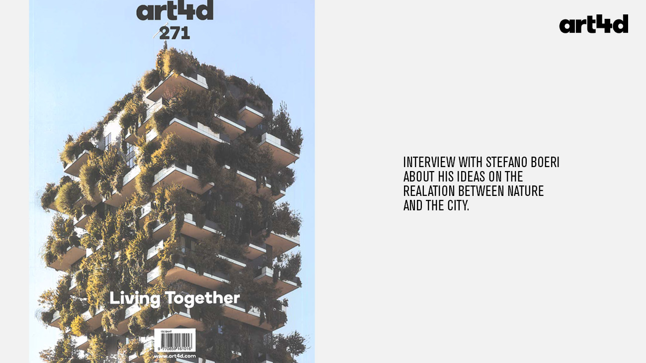 art4d 是一本总部设在曼谷的建筑与设计杂志,在国际范围内发行,该杂志对斯坦法诺.博埃里进行了长时间的采访,通过有意识的垂直森林和都市森林化设计,通过增加人与自然之间的关系,告诉人们对未来的想法和观点。 从米兰第一个建立的垂直森林到坎昆的智慧森林城市,博埃里建筑设计事务所致力于新现实的设计,创造愿景,开辟创新的道路,走向现代经济和社会模式。