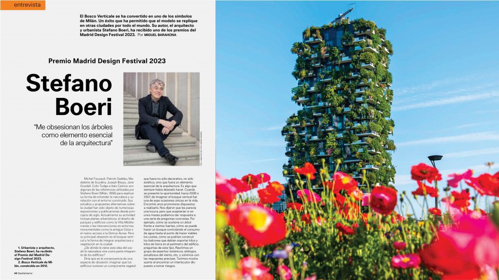 在2023年马德里设计节期间向斯坦法诺.博埃里颁发终身成就奖之际,西班牙杂志《Diseño Interior》对建筑师进行了一次采访,回顾了他建筑生涯中的重要项目,首先是米兰的垂直森林,由博埃里工作室(Stefano Boeri、Gianandrea Barreca、Giovanni La Varra)设计,作为新的生物多样性建筑的原型。
