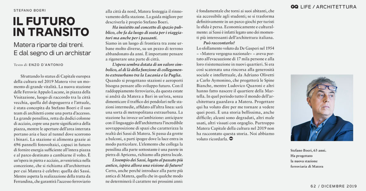 10 12月 2019 gq | 马泰拉fal 中央火车站 在12月的 GQ 杂志上刊登了一则关于斯坦法诺·博埃里的采访,谈及到了新的 Appulo Lucane 马泰拉火车站的落成: 这是一座由石头和钢铁构成的建筑,上面覆盖着一个由696块光伏板覆盖的覆盖层,能够为火车站本身、广场和周围的公园提供足够的能源。 设计与当地的历史和文化活力相联系,由不同的记忆和材料组成,旨在为当地居民创造一个公认的地标,能够为建筑带来价值,同时也是一种启发一个地方的未来和过去的美好愿景。 要阅读整篇文章,请参阅2019年12月刊《 GQ 》。