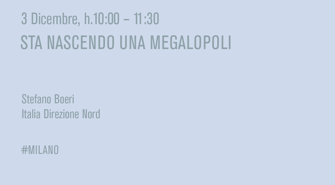 斯坦法诺·博埃里的对话于上午10点在 Fondazione delle Stelline, Corso Magenta, 61进行,这一讨论有伦巴第大区市议员Pietro Foroni, 米兰城市和城市议员 Pierfrancesco Maran, AD Milanosesto Giuseppe Bonomi, AD AREXPO Igor De Biasio参与。由Nicoletta Prandi主持。