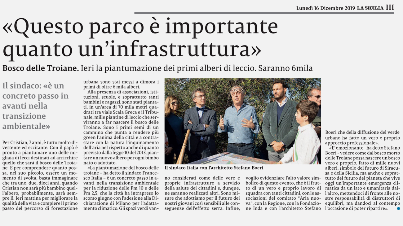 在La Sicilia锡拉库扎版中,有一篇关于为未来的Bosco delle Troiane种植第一批冬青栎树的文章。 这个项目见证了一个漫长过程的结束,始于席卷意大利东北部大片领土的风暴“瓦亚”,在希腊的锡拉丘兹剧院,一百多万棵树被风吹到的树木,它们的树干被重新用于欧里庇得斯的特洛伊舞台布置。