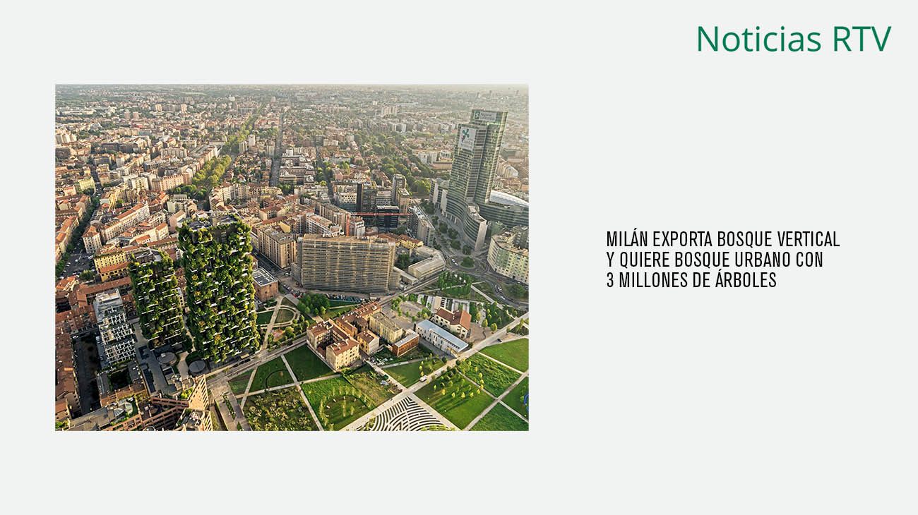 在NoticiasRTV上,对都市森林化进行了一次考察,由Stefano Boeri设计的绿色建筑-包括米兰的垂直森林-米兰市的Forestami项目-到2030年将种植300万棵树木-并传播 涉及“绿色长城”和能够将绿色区域置于每个项目核心的创新型城市诞生的思路。
