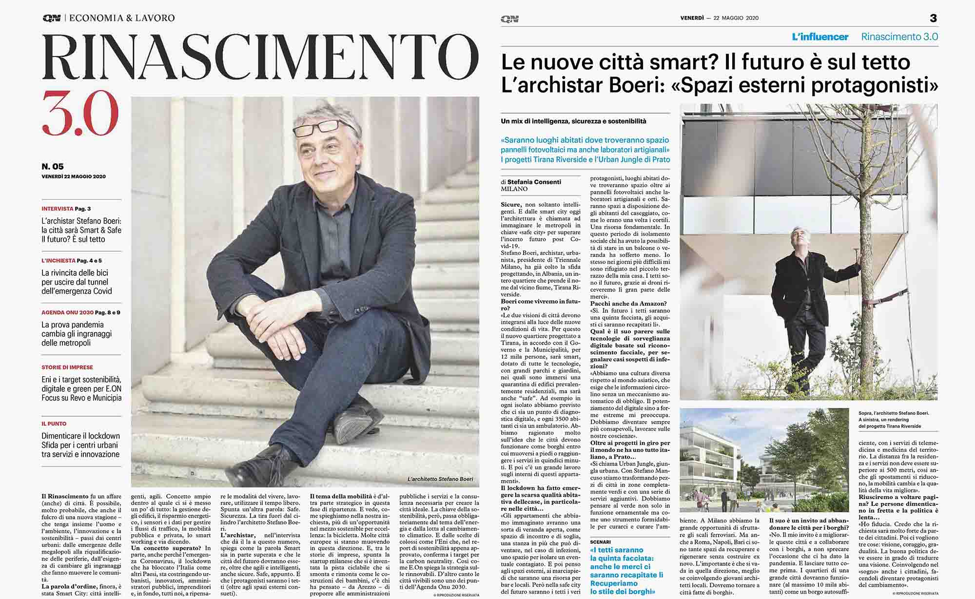 QN的经济插页上,斯坦法诺.博埃里接受的采访,总结了智慧城市的关键概念,以克服不确定的Covid-19后的未来。在能源和食物,水,柔软的出行方式和广泛的卫生系统方面自给自足的社区和现实中,为新生活条件设想的建筑。一个引人注目的例子是为阿尔巴尼亚地拉那河滨地区提出的项目,该项目将容纳12,000人,并配备沉浸在大型公共公园和共享公园和花园中的所有技术。