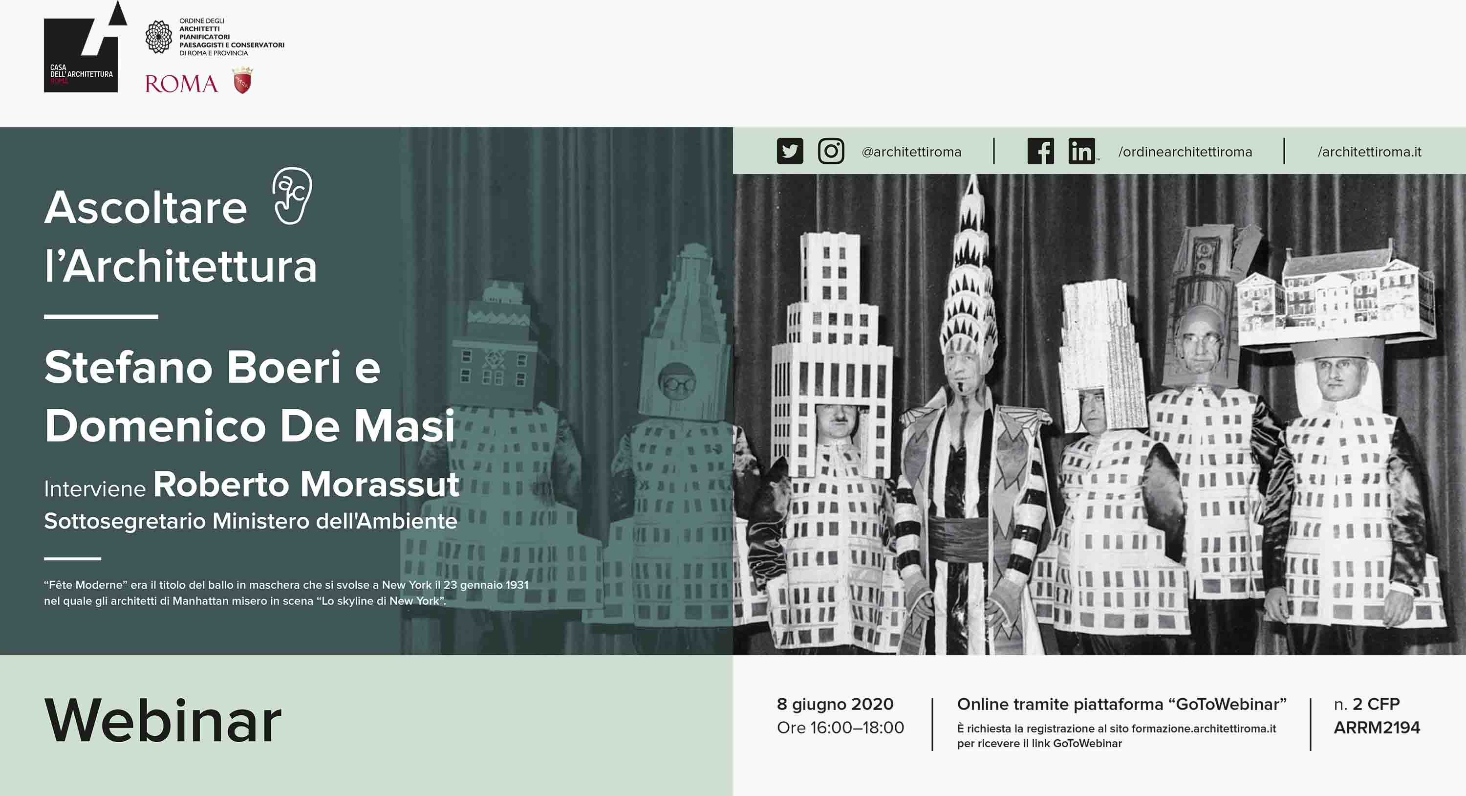 6月8日(周一),斯坦法诺.博埃里参加了一个与Domenico De Masi对话的网络研讨会,主题是“倾听建筑”。这项由罗马PPC建筑师协会组织的活动旨在请比较著名的学者和建筑师,并向他们发出声音,以使他们设法更好地理解建筑在其历史变迁中的意义,以及如何在建筑中重读建筑。 考虑到突发事件的发生以及该学科如何在针对社会辩论的方向上提出解决方案时必不可少。