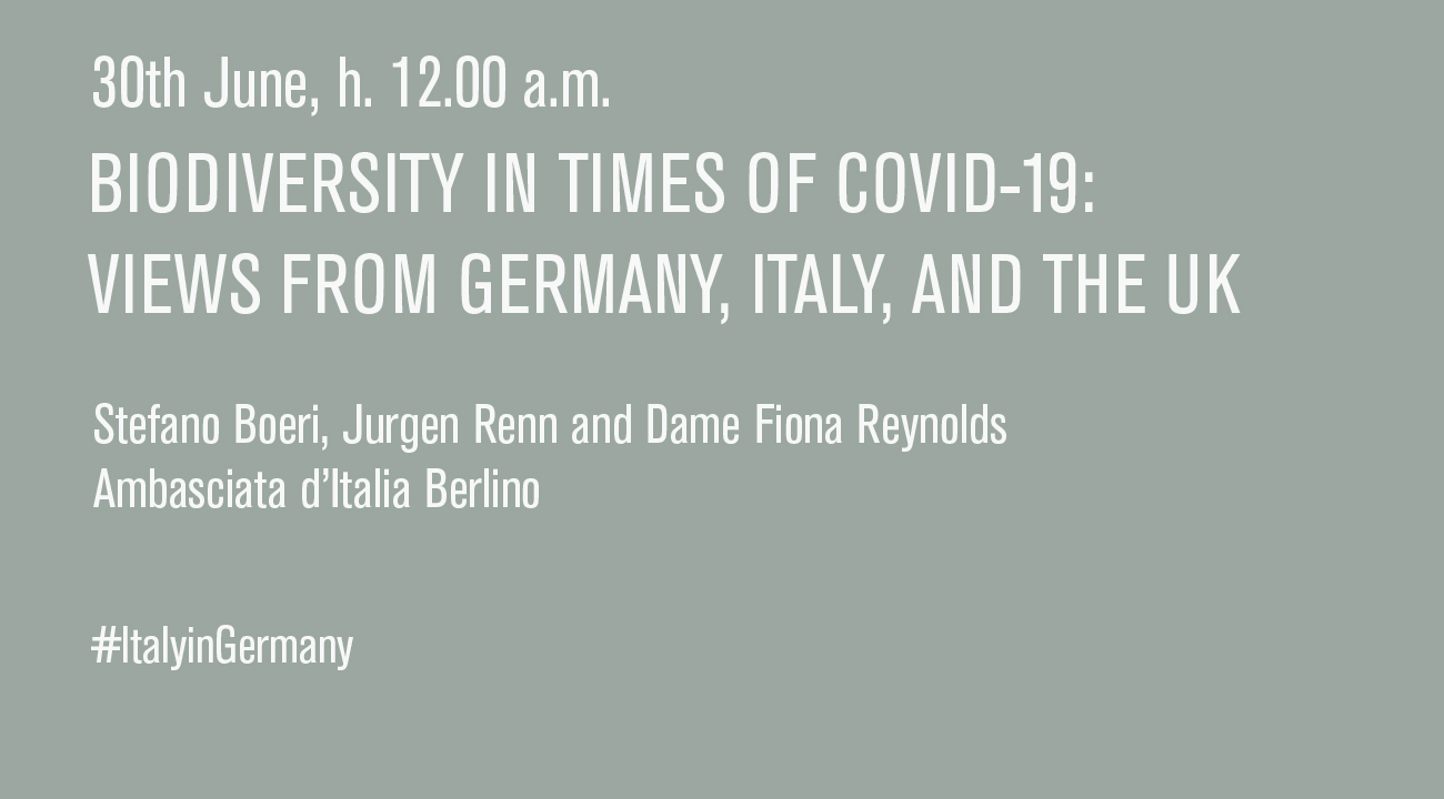 2020年6月30日,星期二,斯坦法诺.博埃里与JürgenRenn教授和Fiona Claire Reynolds女士对话,参加了“ Covid-19时期的生物多样性:德国,意大利和英国的观点” 网络研讨会。