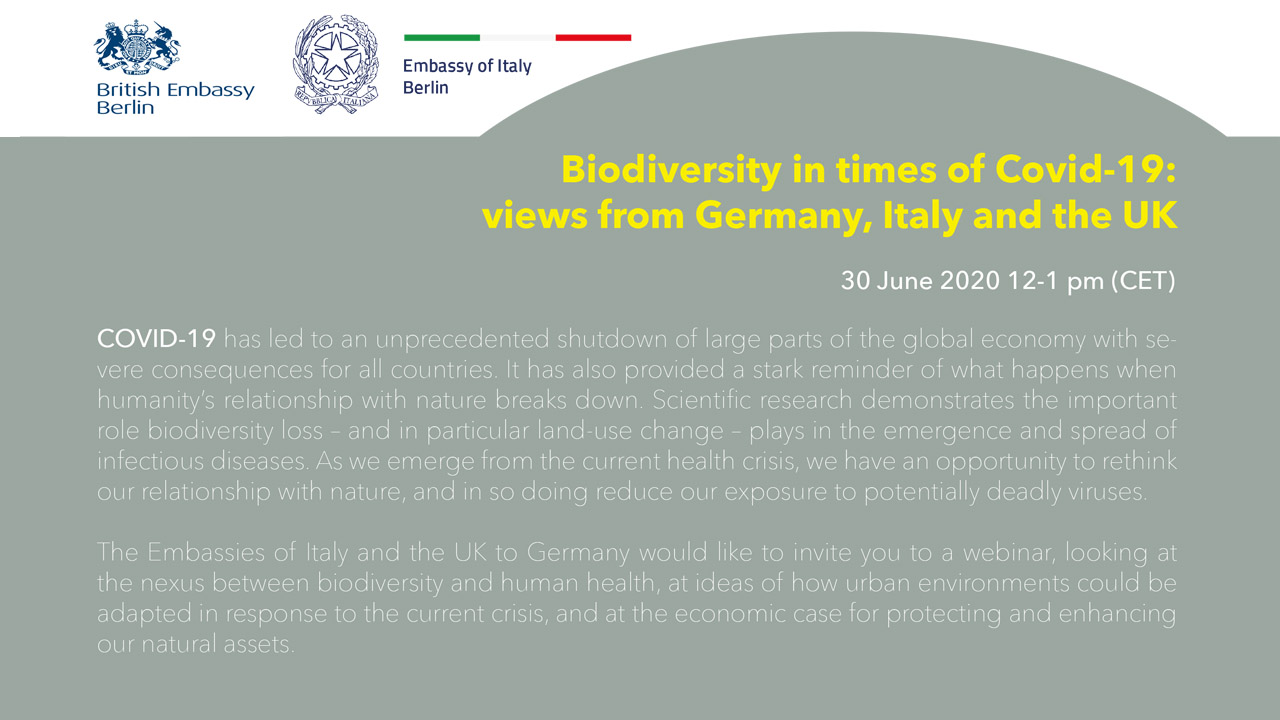 该网络研讨会由意大利和英国驻柏林大使馆组织,邀请所有人研究生物多样性与人类健康之间的联系,并就如何适应城市环境以应对危机,保护和增强未来自然资产提出想法。