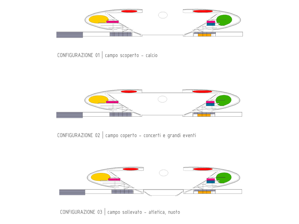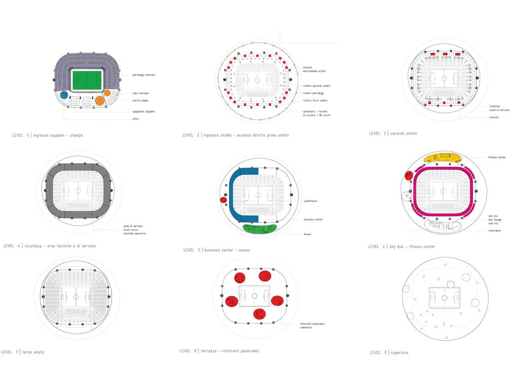 体育场具有不间断运作的性能,包含高度集成的商业空间和住宿设施,并配有灵活的空间,交易会、展览会、会议和音乐会均能在此举办。项目包含一个可以容纳65,000人的3万平方米的体育场的设计,以支持国际足球俱乐部推动可行性研究。 除此,博埃里工作室还证实了在三个全新战略领域安装复合体的可能性,分别是在:Rho-Pero,Rozzano和Sesto San Giovanni。