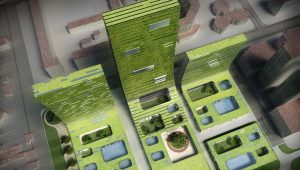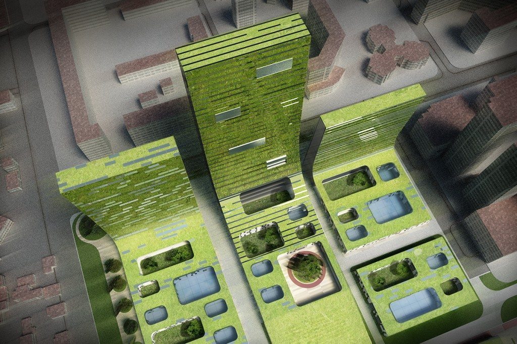 固体波浪创造了一个可以居住的城市公园,将住宅,绿地,服务空间合并成统一的居住区,衍生了一种共生的城市有机体的新型社区。 塔楼提供了一个舒适的绿色空间来过滤城市中污浊的空气。给居民提供了更优质的生活环境。