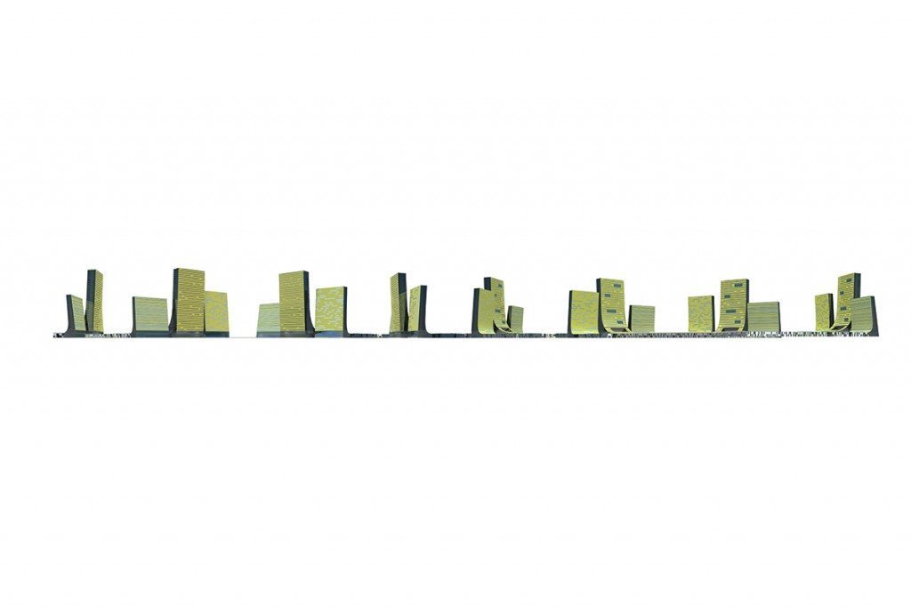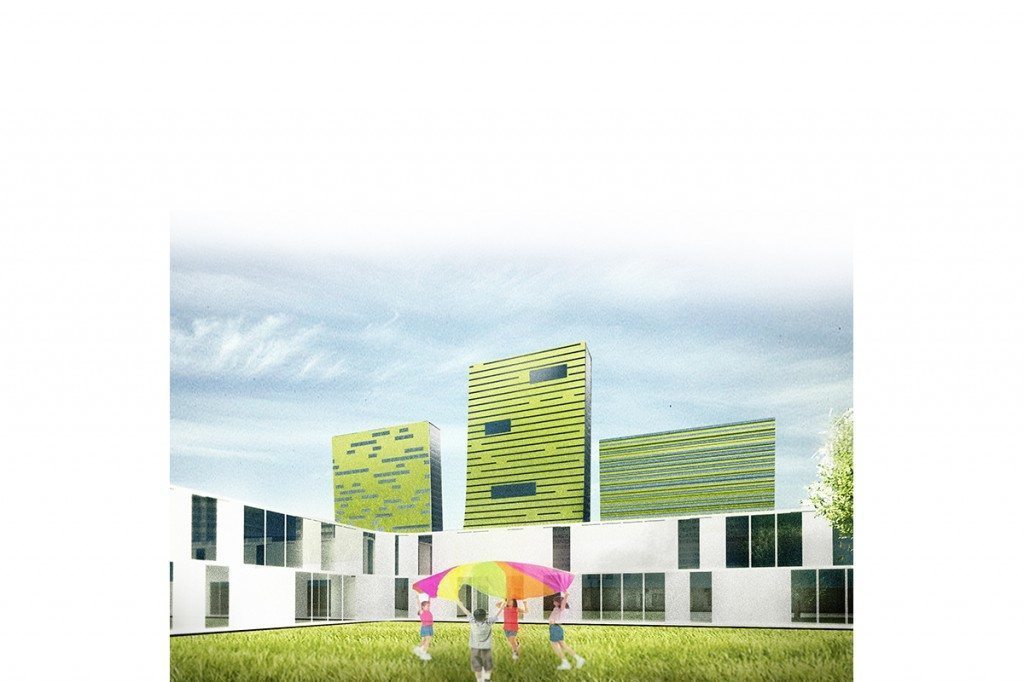 高密度的塔楼通过连续的水平平台向空中升起,绿地的覆盖可以根据公共或私人性质而灵活安排。