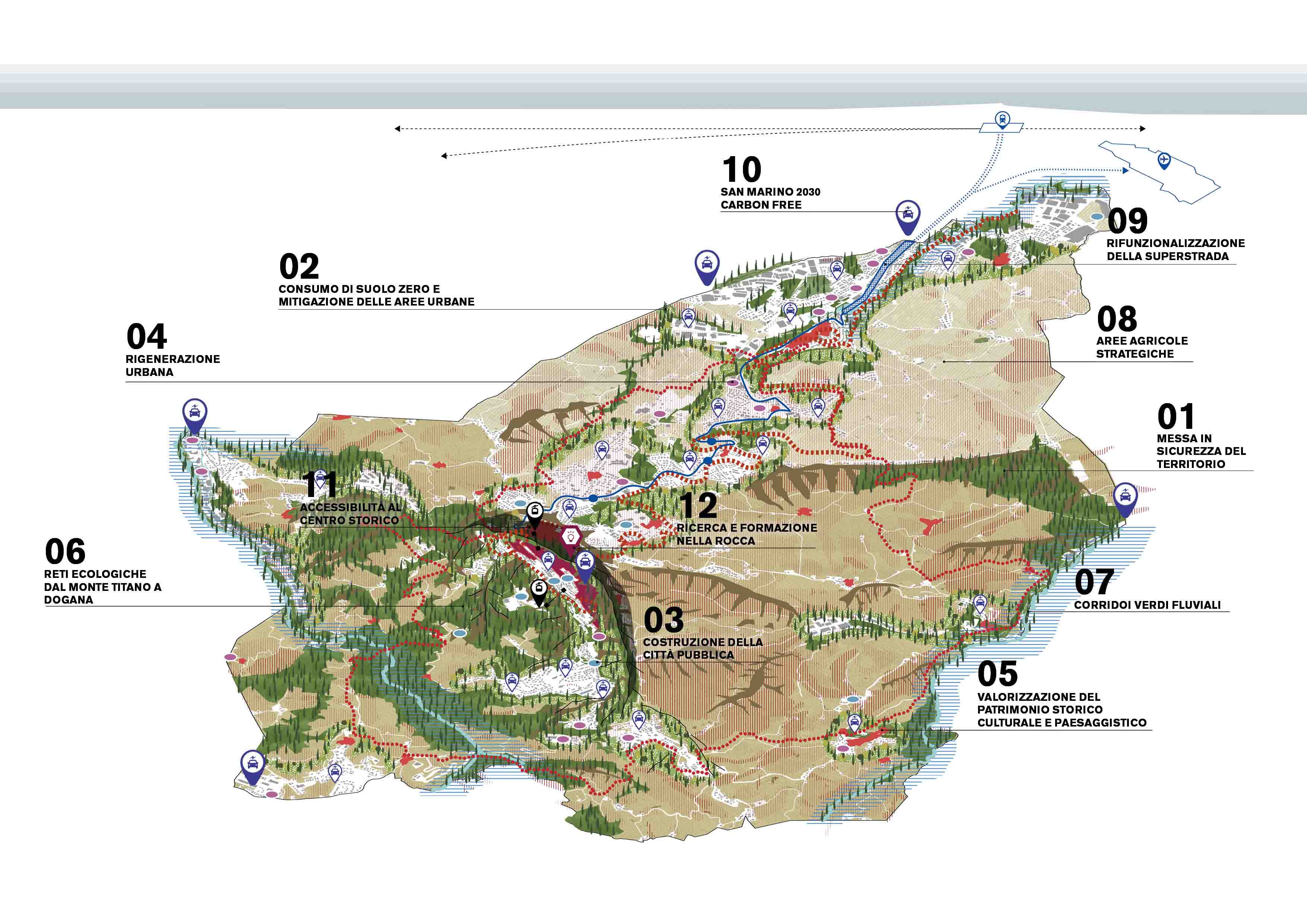 2016年,圣马力诺共和国委托博埃里建筑设计事务所起草新的领土和城市发展总计划。该总体规划分为三个主要阶段 – 战略远景的分析阶段,战略远景的综合考量阶段,以及新规划手段的确定,同时此干预方案还设想让有关的各利益攸关方之间,包括居民和其他既得利益者持续地参与进来,共同交流探讨。在第一阶段的工作中,九个地方市政当局(也就是所谓的“卡斯特里”或者“卡斯尔斯”)组织了一系列的围绕国界的环游活动,其中参与者涉及来自不同阶层的国民,游行的目的主要是为了探讨国家面临的主要机遇以及关键的议题。该计划将时间跨度一下子拉到了2030年,首要的任务是改善重要的环境资源以及共和国的农业景观,并设想着开发一个基于“欧洲花园”和“生物多样性的缩影”这样美好愿景的全新共和国。类似于邻近的意大利景观,圣马力诺共和国的地理景观十分丰富多样,所处地理位置优越,亚得里亚中部海岸城市在此处与亚平宁山脉(Apennines)交汇,并穿过了蒙特费罗(Montefeltro)乡村。
