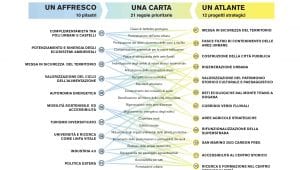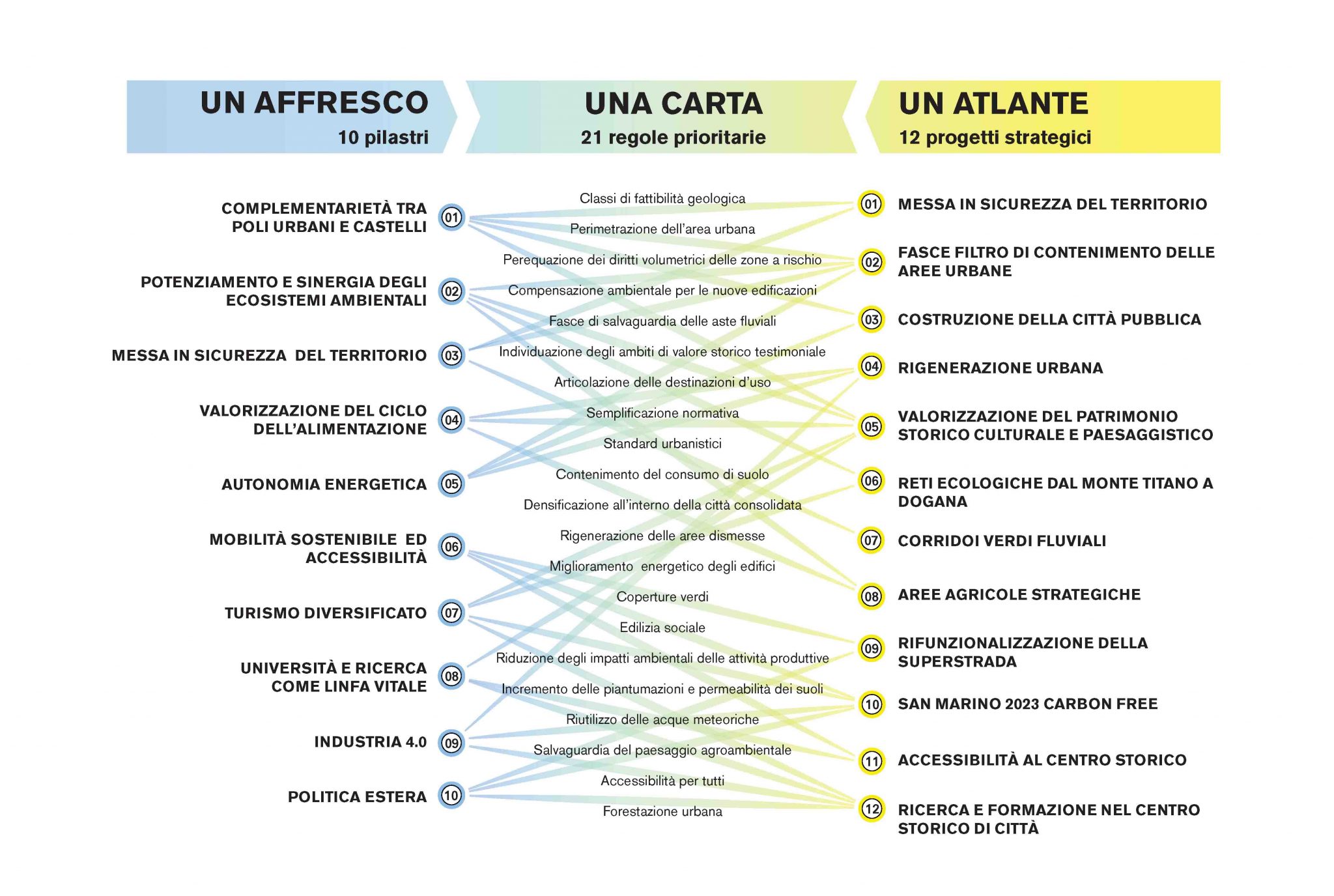 圣马力诺2030计划被划分为三大层次,一是基于十大主题的“城市壁画”(城市中心与卡斯尔斯聚落的互补性/环境生态系统的加强和协同作用/保卫领土/改善营养循环/能源自治/可持续的流动性和可达性/多样化旅游/大学和研究/工业4.0/外交政策),二是包括10项领土规划行动的“项目地图集”,三是为了项目实施过程中传达和管理改进措施而制定的“规则宪章”。