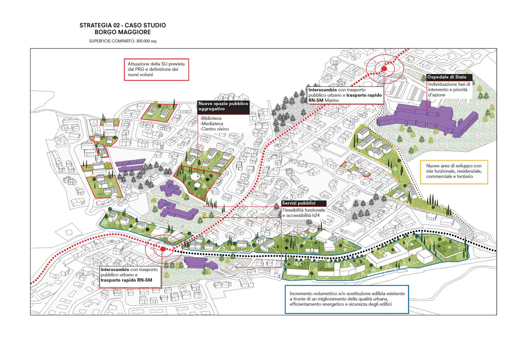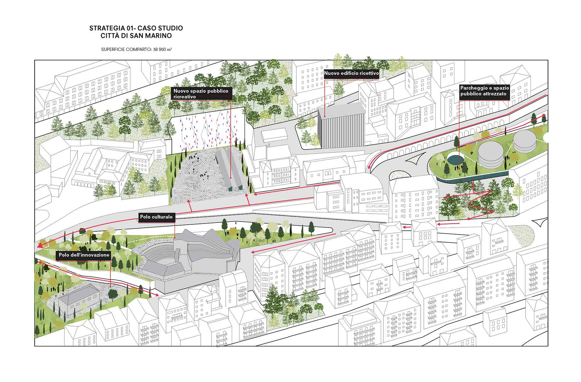 为了增强城市中心和卡斯尔斯聚落之间的互补性,此项目设想通过采用一系列旨在建造、加固和改善现有建筑环境的措施,在此基础上将圣马力诺发展为一个多中心国家。事实上,目前使用不足或空置的共和国实际地产资源估计占总数的30%。