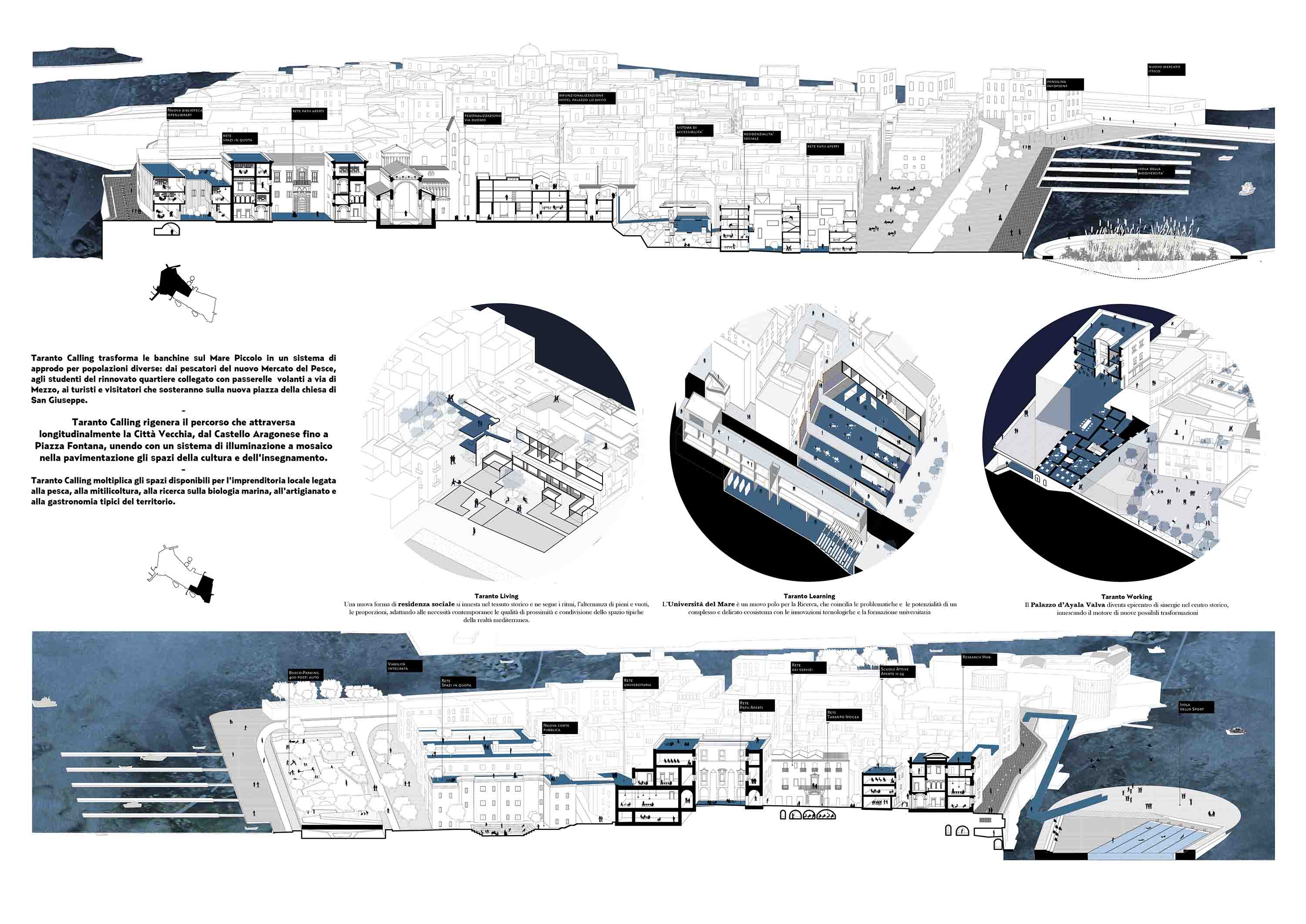 这个由博埃里建筑设计事务所领导的项目被命名为“塔兰托的号召”,是2016年由Invitalia推广的“开放的塔兰托”创意竞赛的三个获奖作品之一。该项目主要是倡议重建历史悠久的老城区。该旧城区地处岛屿上,位于两海之间,目前大部分区域处于遗弃状态,但具有非凡的发展潜力。塔兰托老城就像其大教堂分层建筑一样,可以说是一个时代的时空缩影,城区可见希腊文化遗产、中世纪建筑、防洪堤、文艺复兴宫殿,渔民房屋、商业区、巴洛克教堂、码头和新增的二十世纪建筑。这座石头岛屿上分布着许多狭窄的小巷,周遭是围墙和码头,被海洋包围着,岛上有着各式洞穴、石窟和通道,这些地貌沿着垂直线将房屋屋顶、露台和大海连接了起来。旧城融合了地中海所有的城市景观,作为一个只有几百平方米的岛屿/城市,它拥有地中海所有港口城市都具备的特点和影响力。