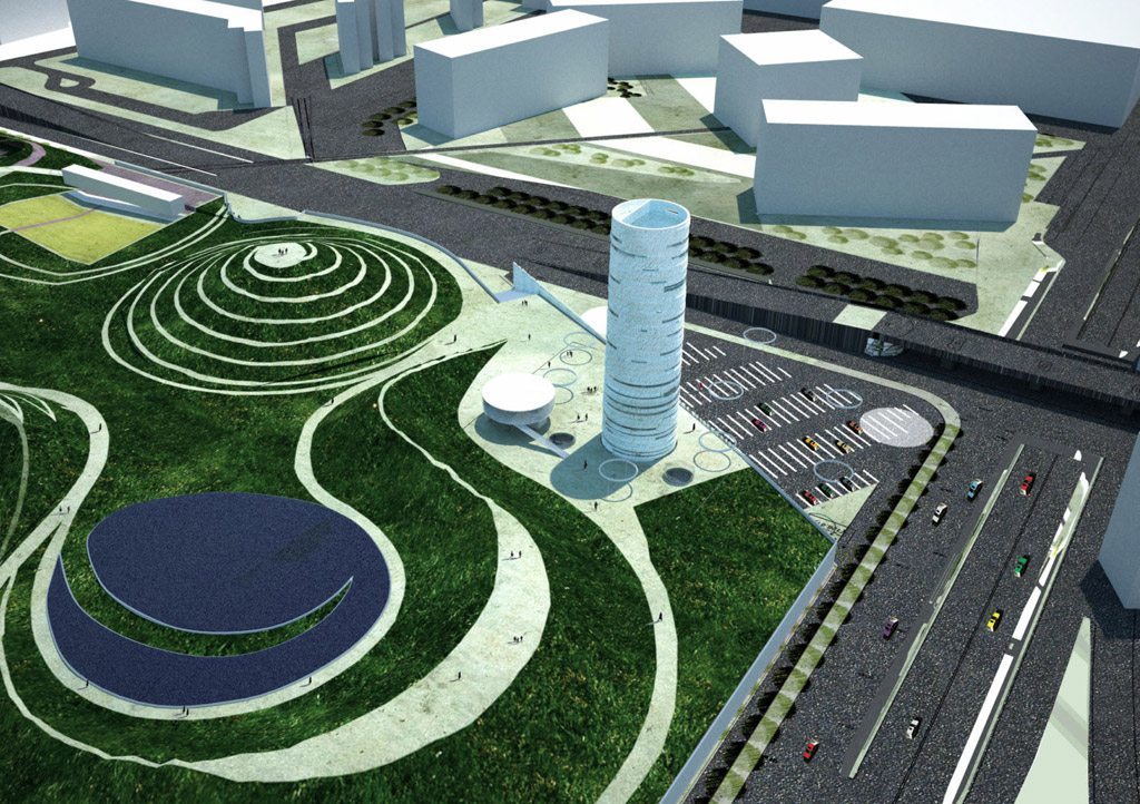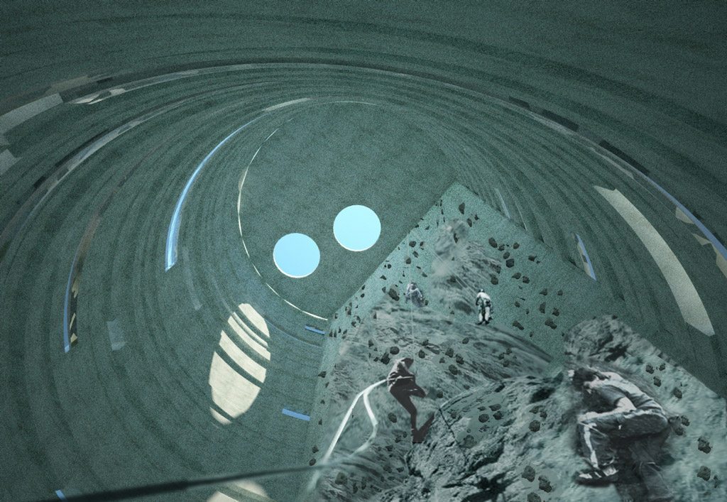 山形建筑是为山地运动相关项目所建造的建筑。基地和地下四层空间作为混合功能空间,集商业、培训、办公和会议空间为一体。 另外,55米的高塔被专门设计为攀岩使用空间。