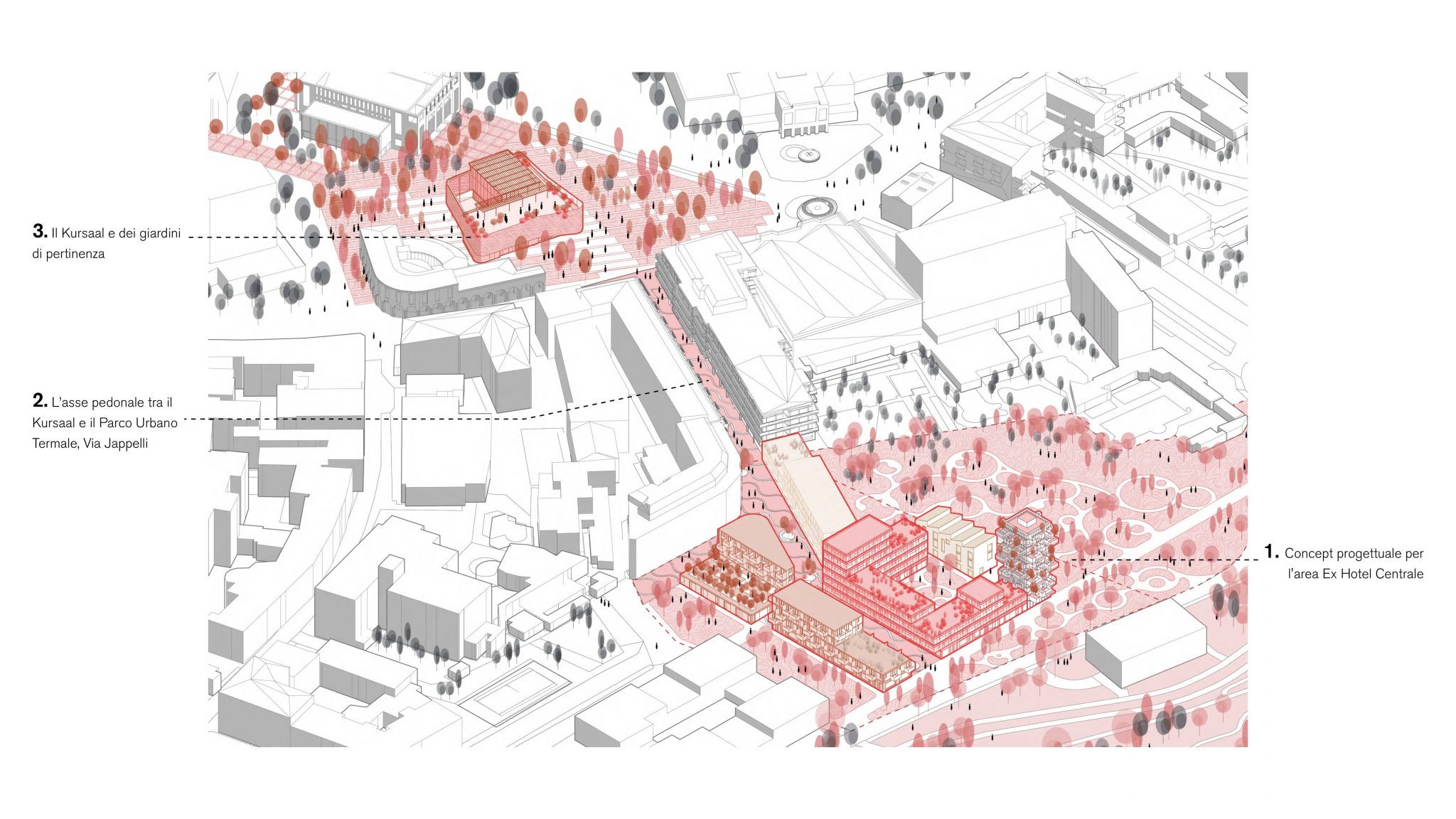 阿巴诺泰尔梅(Abano Terme)库尔萨尔(Kursaal)周边区域的更新改造项目,旨在重塑这一城市标志性场所的核心地位与全新活力。该项目纳入了一项城市整体战略,通过将库尔萨尔及其花园与通往城市温泉公园(Parco Urbano Termale)的新步行连接轴线相结合,打造一个由公共空间、绿地和步行路径构成的连续系统。