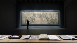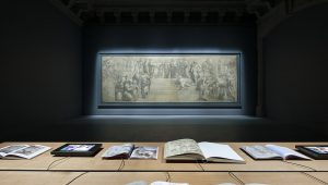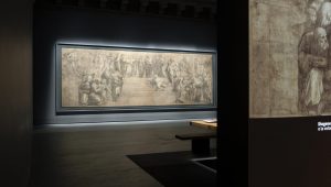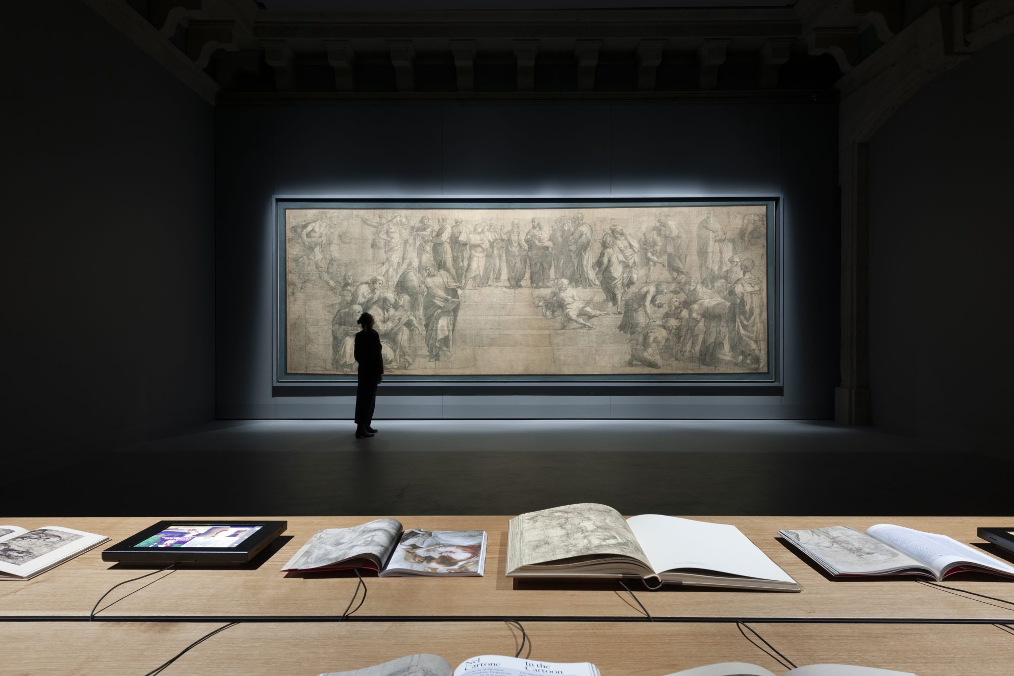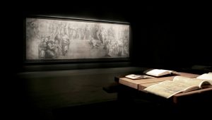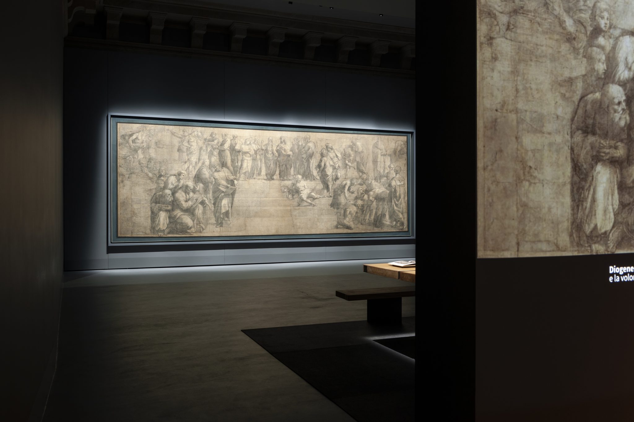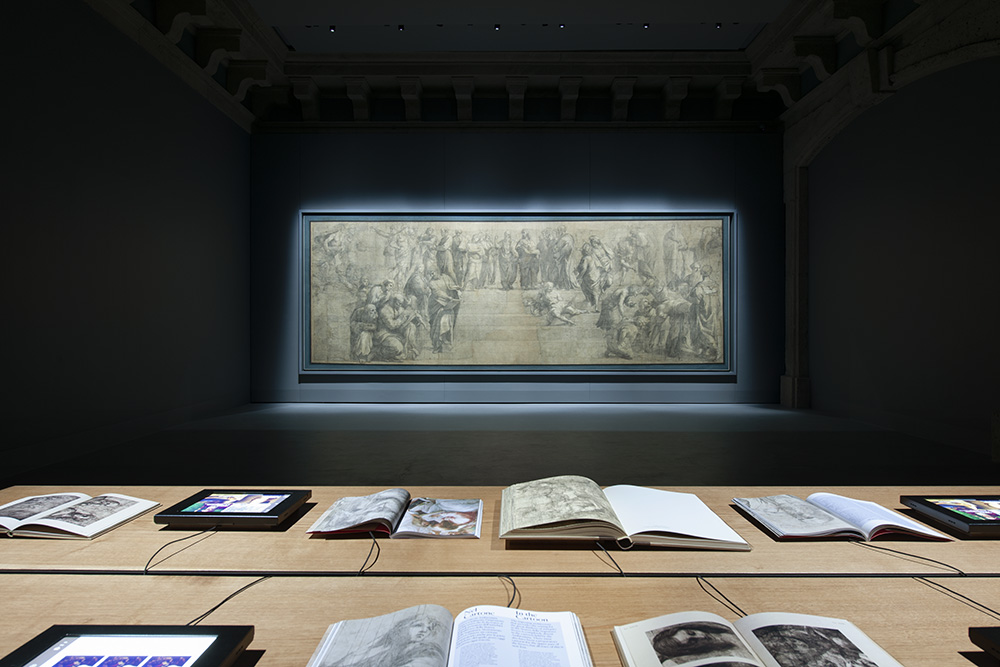 “我们所有关于新展示空间所作的抉择,都基于对这一伟大图稿的了解,即都所有设计目的都是为最终壁画在公众面前的呈现效果做好准备。这幅画稿本身就代表着这一美妙的含义,它在当时就已经是一幅完成的作品, 但又被作为最终作品的准备步骤的图稿来呈现,” 斯塔法诺·博埃里(Stefano Boeri)说道。“出于这个原因, 我们为这个展厅设计了一张橡木制成的长桌 (由Riva1920制作), 旨在收集与图稿相关的文献和历史文献, 关于这一画稿是如何完成的, 以及它与梵蒂冈博物馆Segnature大厅的壁画之间的联系。