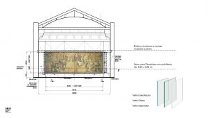 “Ben Finito Cartone” 由一个和作品相同尺寸的,宽8米, 高3米的一整块玻璃和保护箱构成对作品的保护, 该装置是通过在美术馆外立面侧边切开一道裂缝运输进大厅的。双层夹层玻璃板经过抗反射和超清晰处理,可以让观者获得最佳视觉感受效果,此外还进行了抗紫外线处理,避免210张纸张变质,并设计成维持湿度参数不变,旨在更好地保护画稿。 此外,保护箱门可以打开,以便检查工作的进行以及通过铝和木框架调节其张力。