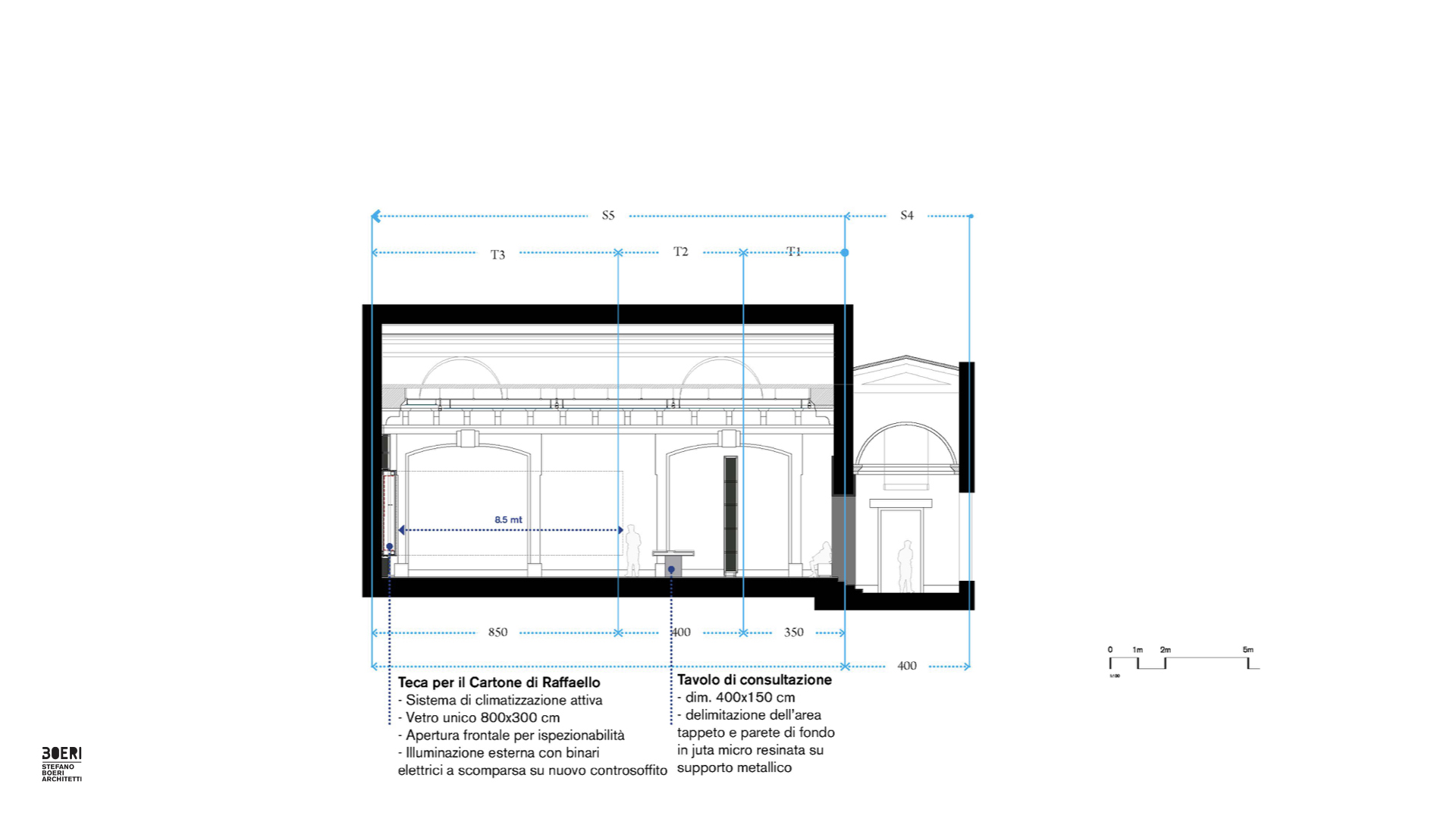 “原有的装置设计一部分由Luigi Caccia Dominioni在1960年代完成,另一部分由Griffini在1990年代完成。在此基础上,我们保持了原有的一些元素, 比如放置图稿位置的西墙以及画作前的过滤壁,尽管如此还是从根本上改变了欣赏这幅作品的认知感受。”博埃里建筑设计事务所(Stefano Boeri Arrchitetti)的项目总监Marco Giorgio说道。