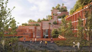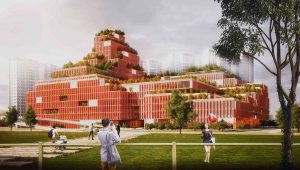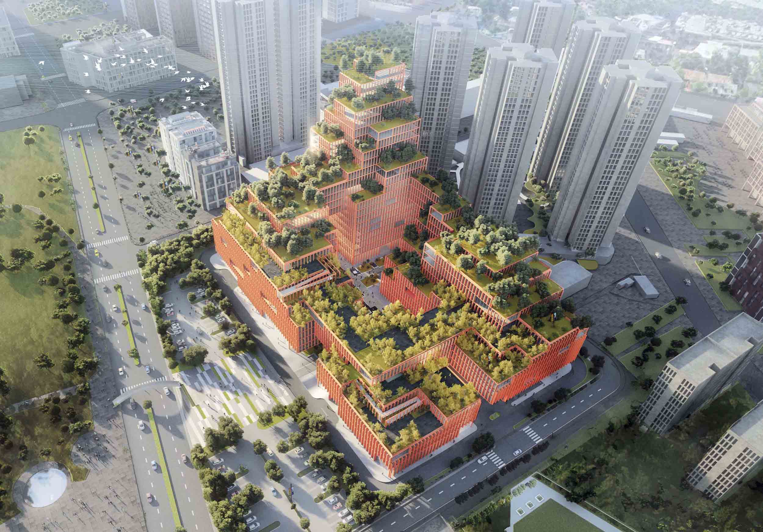 深圳市创新创业无障碍服务中心由博埃里建筑涉及事务所中国设计,是一座完全无障碍的公共建筑,并与龙华区的城市结构相结合,它发展了与残疾(包括身体和认知)、社会包容和凝聚力等主题相关的先锋概念。该建筑群毗邻城市公园,直接与都市的轻型交通系统相连,整体上是一座绿色的疗愈之山。这是一个沉浸式和具有包容性的绿色治疗场所,其中服务的可及性和空间舒适度是这个项目的关键,它开辟了康复中心新的可能性,超越了传动的设施和场地概念,成为一个可以真正与自然密切接触和互动的空间。移动性和无障碍性的主题在该项目中发挥了基本作用:地下停车场的存在排除了汽车在该地区的流通问题,为环境友好的运输方式、绿色空间、步行等区域预留了空间,供市民使用,打破了建筑障碍。建筑利用屋顶花园,加强了室内外之间的关系;同时,产生的光合作用,吸收城市烟雾中的碳颗粒;整合先进的可再生能源,满足建筑自身的供能需求,最终形成生物多样性、促进城市生态平衡。