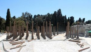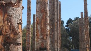 死寂森林融入剧院的舞台,与其后方的古老的活着的树木形成了鲜明的对比。 实际上,该项目同时面向人类与树木观众,并与之对话,给予两者同样的重视。树木规则的布置,让人回想起古希腊庙宇的完美比例和柱子的原型。这些树木是突然被狂风折断的,被摧毁的树木的轨道切断了“神庙”,带来不稳定和焦虑的感觉。250根树干,分别是4米,5米,6米,甚至是8米高,构成了一片森林,犹如主人公和唱诗班的避难所,但也注定是他们的监狱,就像被打败的特洛伊出现在孤儿寡妇面前一样。这些演员都是没有名字的, 希腊人和特洛伊人包括舞台,全部都覆盖着战争的尘埃, 他们还活着,但悲剧的序幕预示着奴隶和主人的悲惨结局,让他们看起来像是行尸走肉。