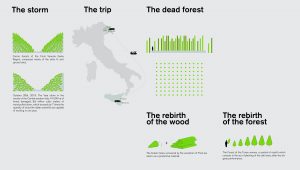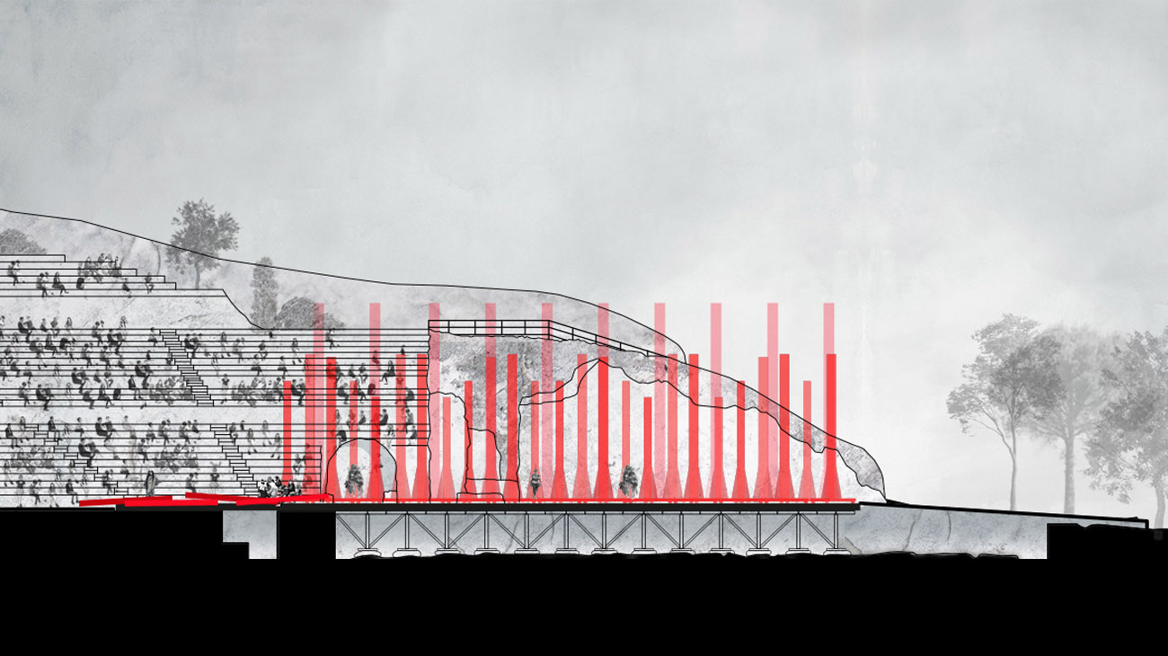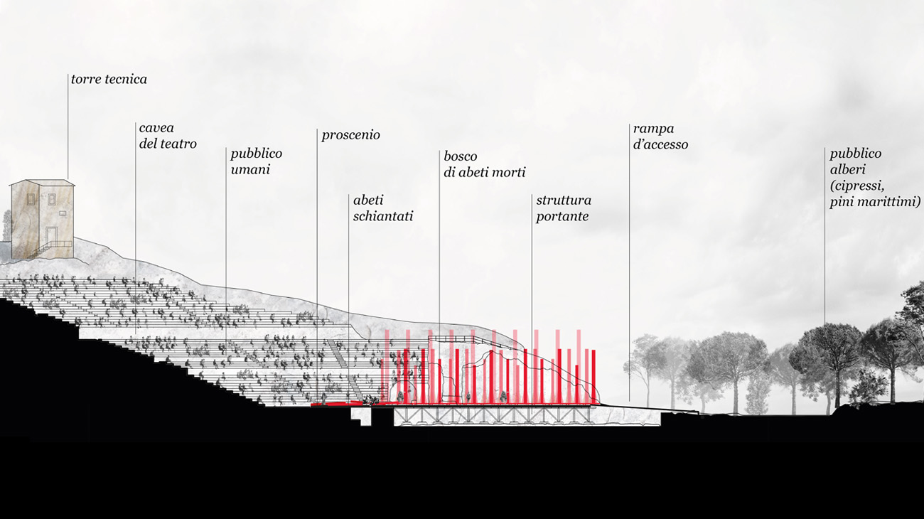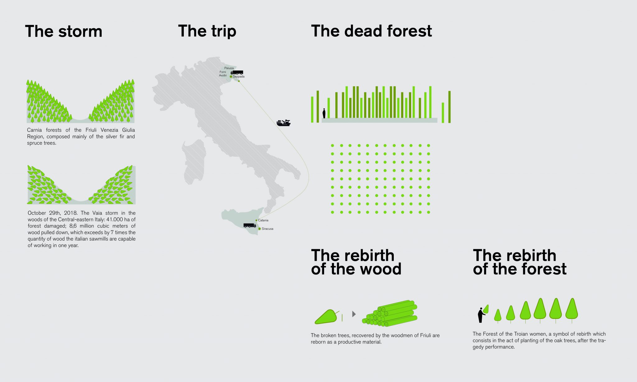 欧里庇得斯的悲剧《特洛伊妇女》的场景项目更多是一种对景观的理念,而不仅仅是存在于锡拉丘兹的希腊剧院暗示性环境中的建筑。但在这个古代舞台上,所呈现的并不是繁华如画般的自然景色,而是首次展现了大自然毁灭性的力量。这场悲剧所传达的信息就像常青之树一样清晰明了: 任何战争都是毁灭性的、无用的,无论参与战争的双方的信仰是什么,永远都不会有赢家。“死寂森林”项目将一般的反军国主义理念提升到了一个更高的层次: 它将人类之间的战争升华到人类物种与自然之间的全球关系上。根据导演Muriel Mayette-Holtz的想法,特洛伊妇女就存在于我们的生活当中,她们是逃离灾难与被毁灭的家乡的难民,到海外寻求更好的生活。她们是恐怖主义袭击的受害者,困惑而迷茫。但与此同时,她们也是在意大利东北部弗鲁里·韦内齐亚·朱利亚(Friuli Venezia Giulia)Carnic林区的数百万棵被Vaia风暴摧毁的冷杉和云杉。2018年10月29日的风暴破坏了41.000公顷的森林面积,其所带来的经济和环境影响尚待分析,但即使是粗略的估计也证明了该地区受风暴灾害所被摧毁的木材的数量,远比所有意大利锯木厂在1年内可能制造的材料的数量高出7倍。