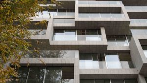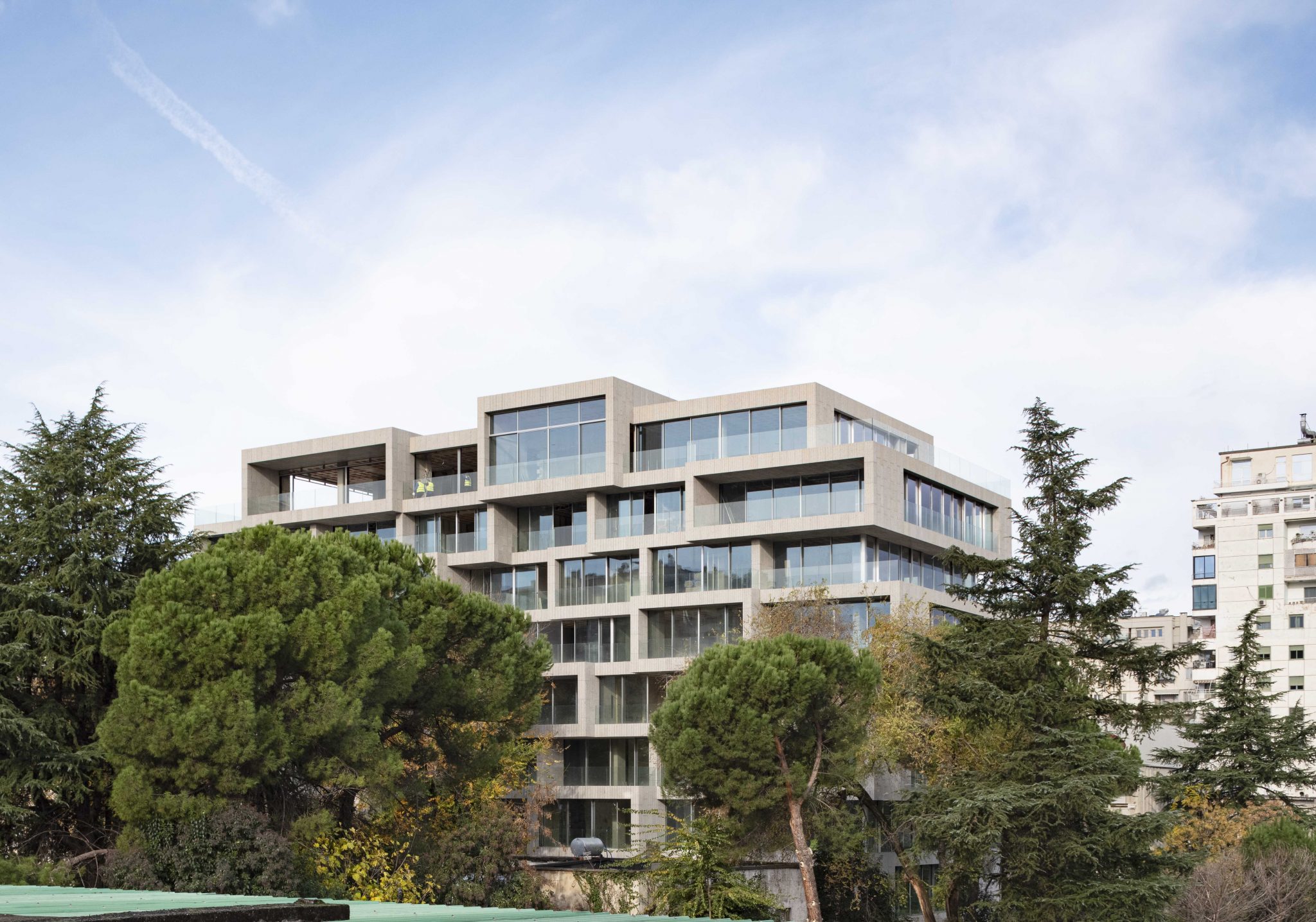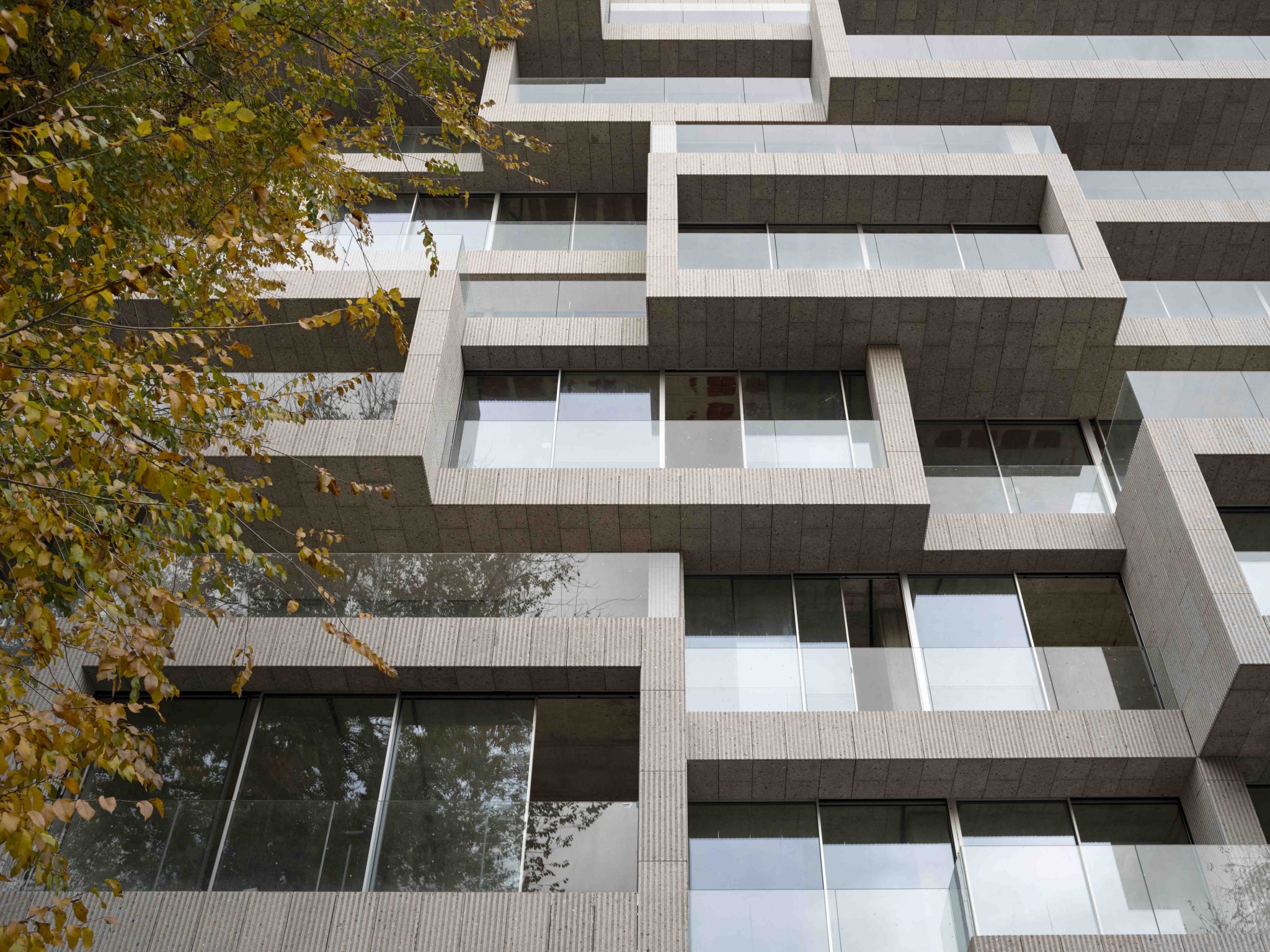 住宅单元在两个方向上的矩形变换通过交错层产生了具有特征的立面, 悬挑赋予了满的和空的空间相互作用的生命,通过坚固的石头框架强调,突出了每个住宅单元和其特定的独特性质。住宅的玻璃护墙通过安装全高玻璃墙, 与覆盖着木板材的平面交替放置, 使之更突出并增加了建筑本身的视觉感受。其中一个立面细节, 增加了材料的选择,垂直轮廓板增加了它们的运动和颜色变化。凹入体块和凸出表面的交替给每个室内环境和每个住宅单元提供了享受私人户外空间的选择,这些空间中丰富了常规的植物元素,进一步突出了立面的设计和材料处理。