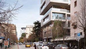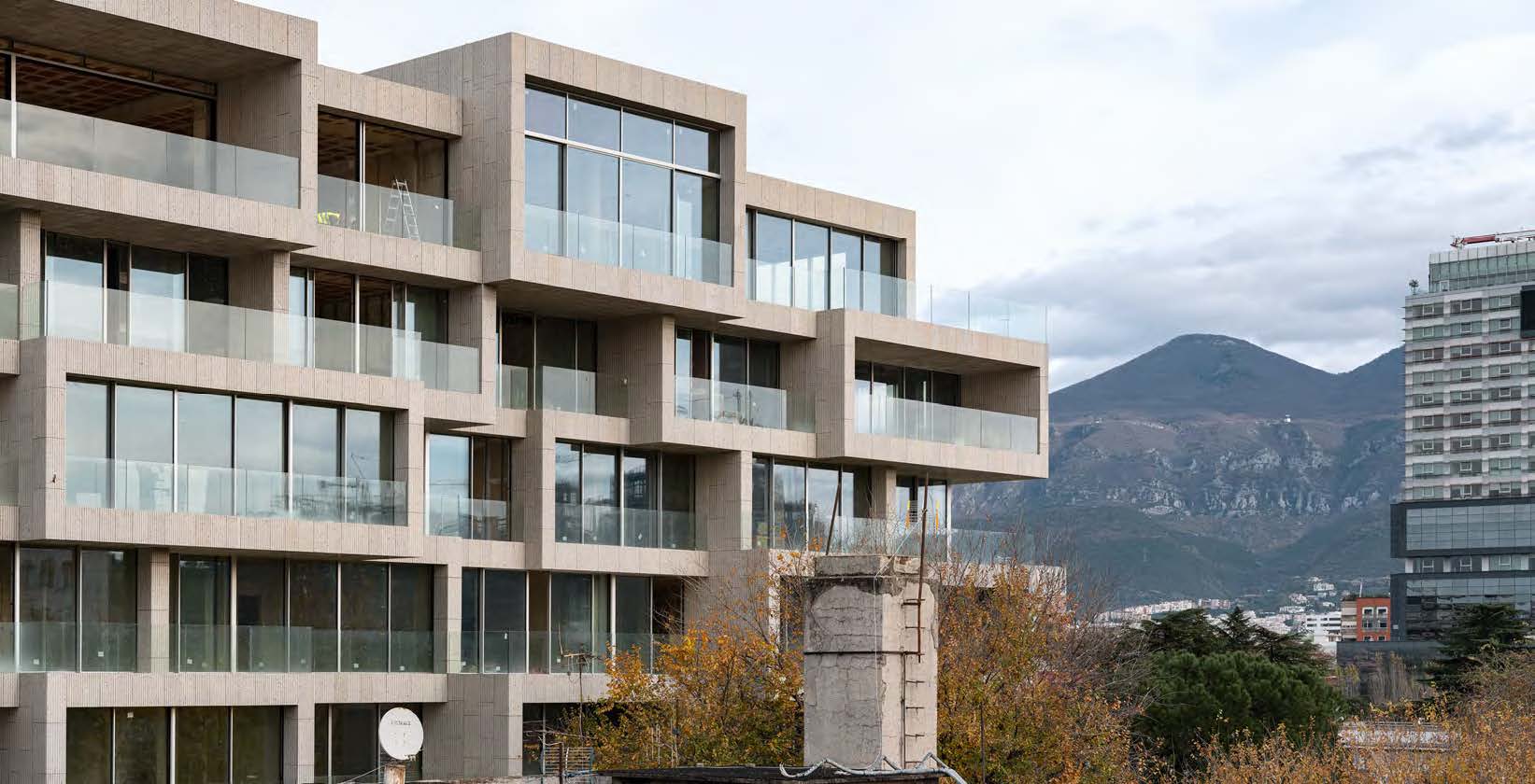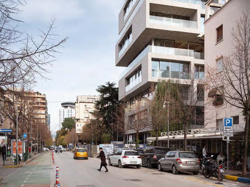 位于地拉那Blloku中心区, 在阿尔巴尼亚政府的总统大楼附近的西部住宅项目占地又长又窄, 它位于一条主干道上,较短的立面通向主干道,而更大的外立面俯瞰着城市结构中的大型公共空间,使其能够与该地区的其他公共建筑直接对话。建筑由重叠的立方体组成,一系列略微交错的独立住宅模块,每个住宅单元至少有一个凉廊或阳台。该建筑方案为30个公寓中的每一个都提供了不同的视觉,从而为所有居民提供了地拉那市的整体观感。此外,每个住宅单元都有双重朝向,不仅能提供最大的视野,而且最重要的是能提供最大的采光和自然通风。这种结构的设计也意味着公寓不完全重叠在一起, 但当中存在一种相互作用, 想要把一层的公寓放在下面的两个公寓之间, 从而导致允许外观设计”移动”的故意错位感。