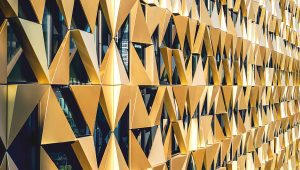 办公室所在楼层的内墙(即“第一层表皮” )由一个支撑结构构成,该支撑结构的立柱和横截面为箱形截面铝型材,可见部分为双层玻璃,预组装的拱肩板上的外部饰面为背涂玻璃,与楼层的不可见截面一致。外墙,也就是“第二层表皮”由铝护罩构成,该护罩由模块化面板组成,子结构为金属型材,外覆三角形折叠铝板,覆盖着该大楼的一楼。大楼外墙用可见的尖托架固定在第一层立面的箱形截面铝立柱上,有约15 cm的间隙,以便对建筑进行外部清洁。更具体地说,确定立柱倾斜度的模块为110 x 110 cm,因此外壳的主要部件被标记下来了。