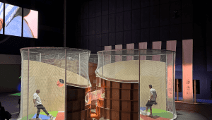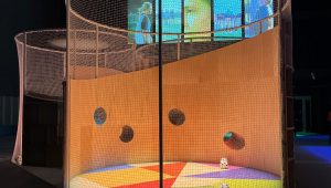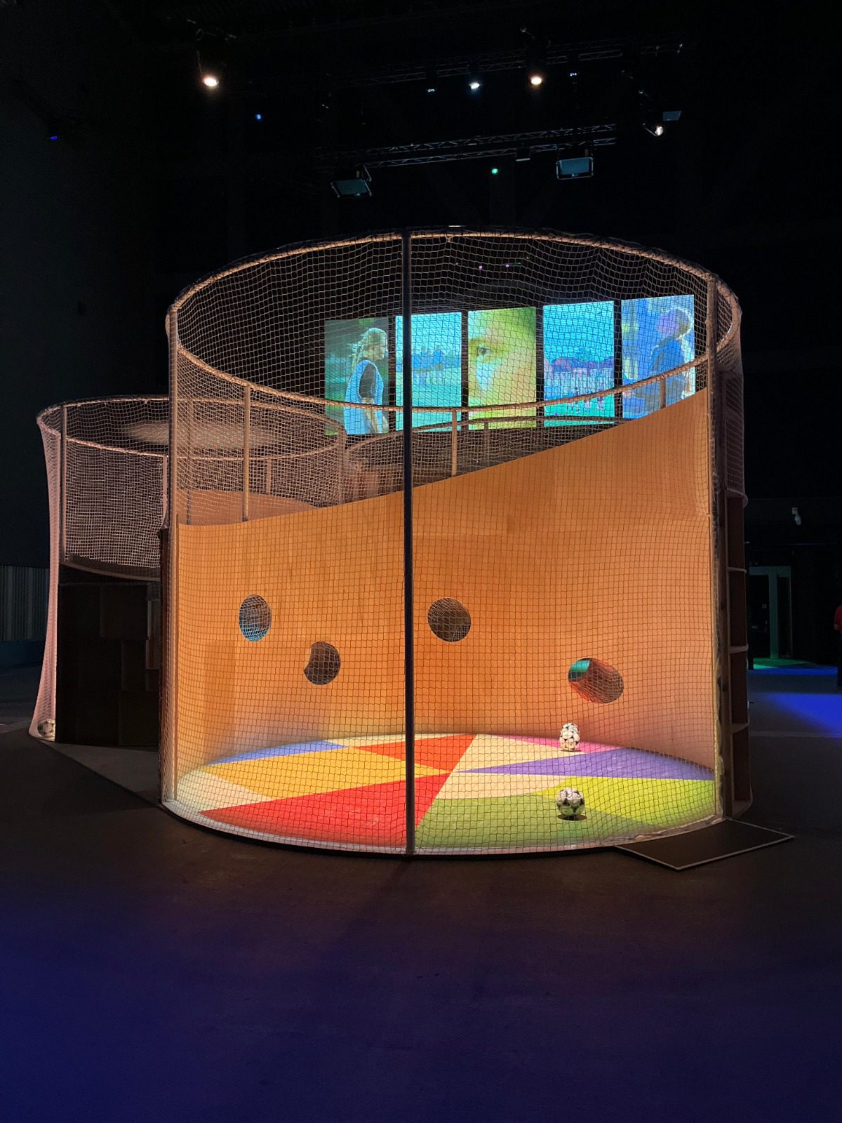 装置由三个圆形空间构成,地面采用图形贴膜界定区域——此为与墨西哥艺术家Eduardo Terrazas的合作成果——四周由模块化墙体系统围合。墙体采用胶合木型材与3/8英寸多层板制成,灵感源自滑板坡道并垂直搭建。墙面开有圆形孔洞,经职业球员参与设计,孔径足以让足球穿行,从而促进空间间的动态互动。每个区域由白色尼龙网围成,形似足球球门,内置一名球员,初始配置为每笼三球。参与者在限定时间内相互对抗,力求以本方区域剩余最少球数结束比赛。